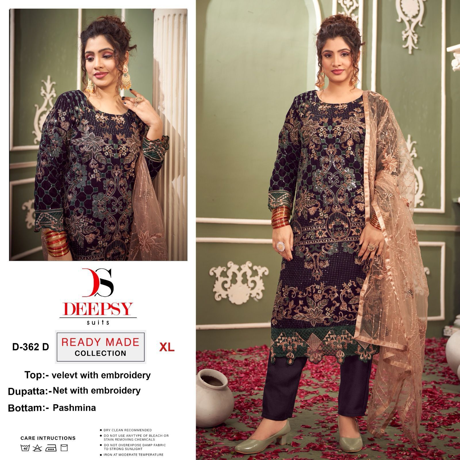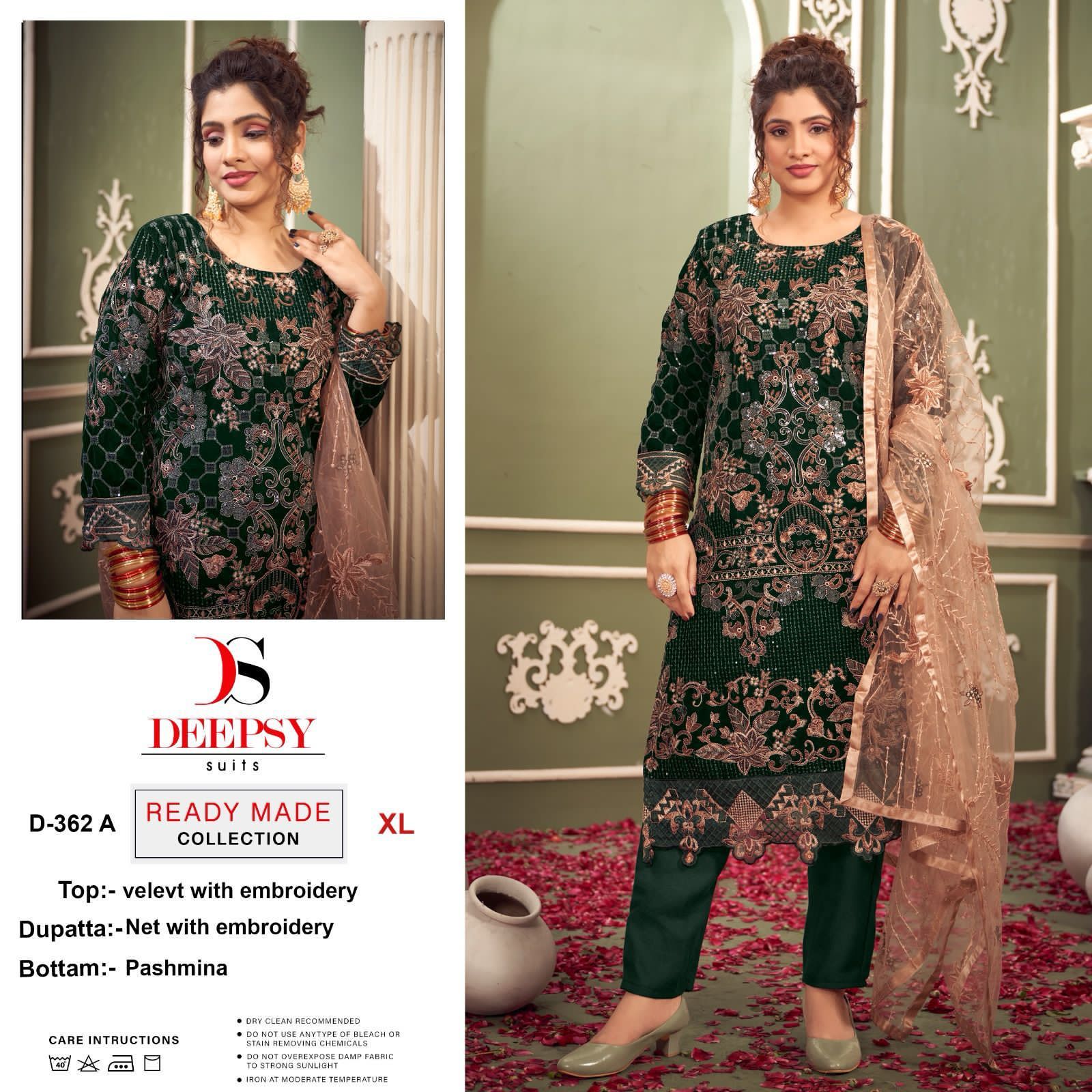 *Ready to wear velvet collcetion by DEEPSY SUITS* *D-362 ABCD READYMADE COLLECTION* Top - Velvet with heavy embroidery Bot- Pashmina Dup - Net with embroidery Size- Xl-XXL *Rate:-1500 + GST* *_Quilted Fabric Used For best quality results_* 100+Singles |