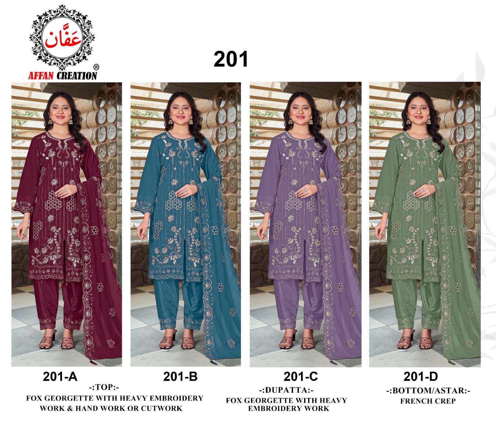 Design No 201 by AFFAN CREATION suit collection manufacturers surat