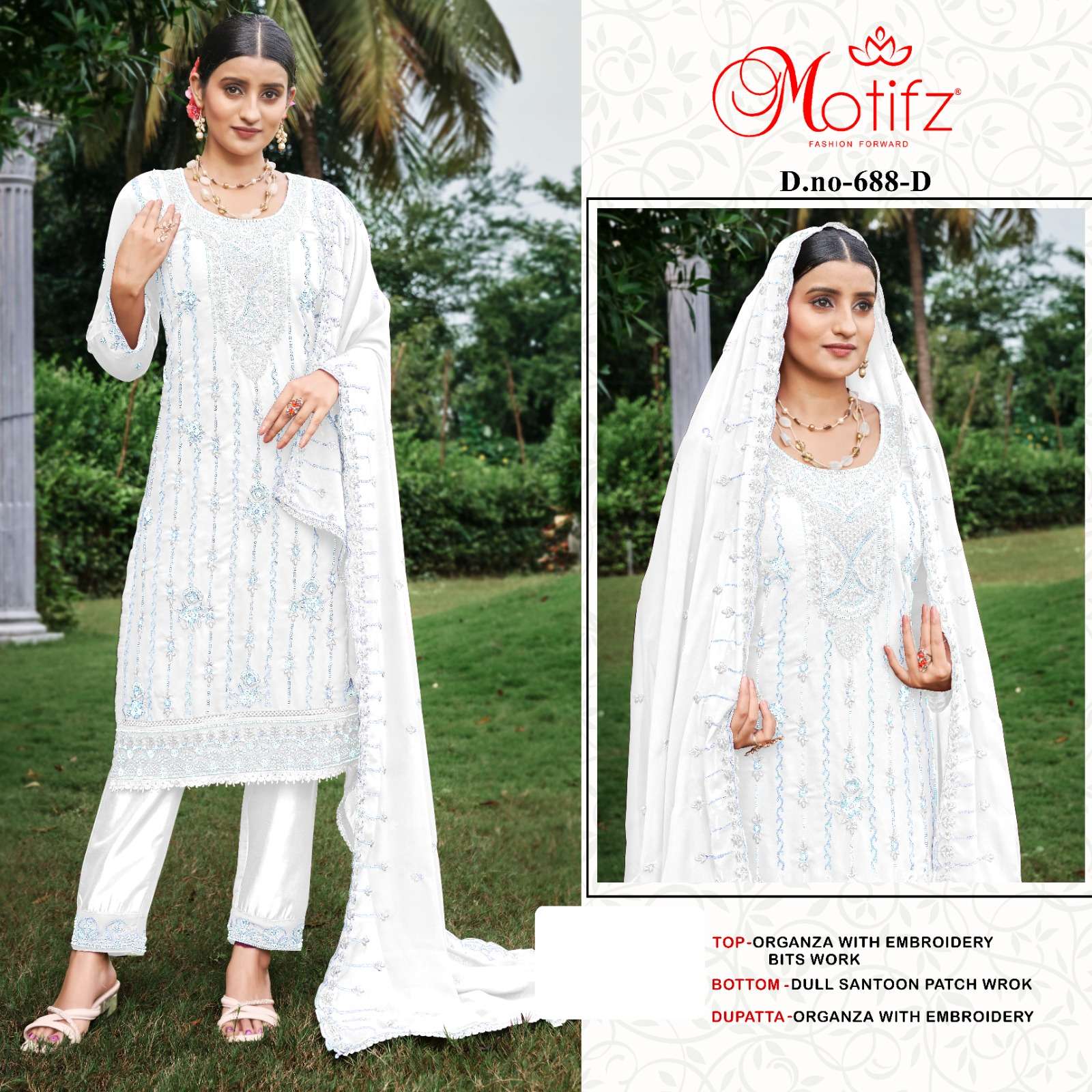 Buy Online Design no 688 by Motifz Organza suit collection manufacturer surat 4 Pcs of Full Catalogue at Wholesale Price. Looking for Design no 688 by Motifz Organza suit collection manufacturer surat Full Catalouge at Best Price? Buy Now Design no 688 by Motifz Organza suit collection manufacturer surat at Wholesale Rate of Rs 5996 with Total 4 Pcs from authroized dealer and supplier of BRAND'S Brand. Cost of Each piece is just only Rs 1499 which is very low and affordable price to resale the product in your retail store ,This is Surat based Wholesale Supplier & Dealer of BRAND'S Brand. Click on Brand name to Know more about BRAND'S Brand's products.Call or Whatsapp on 9898838984 for booking or enquiry