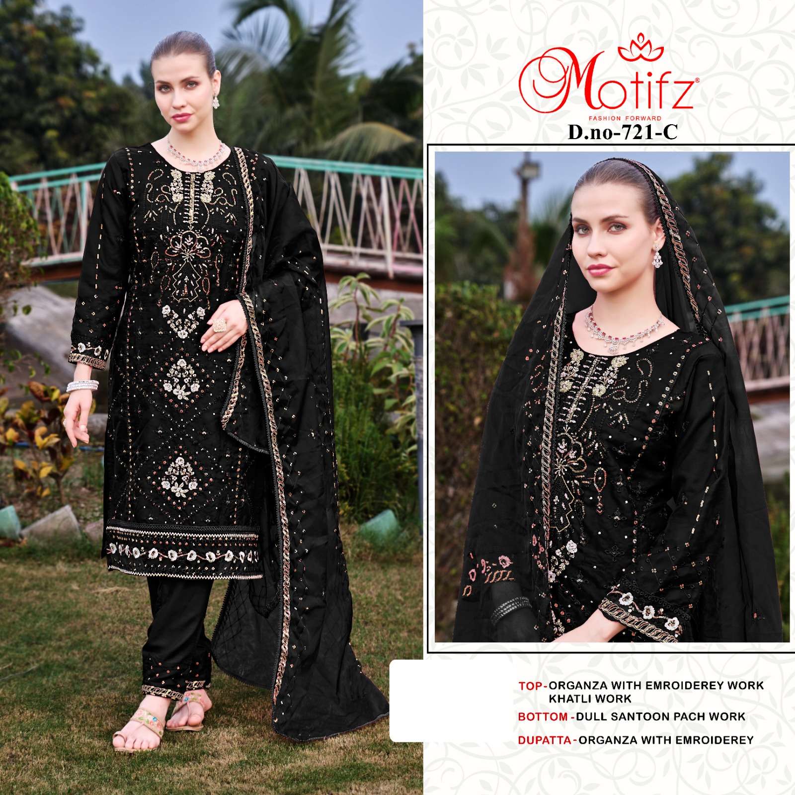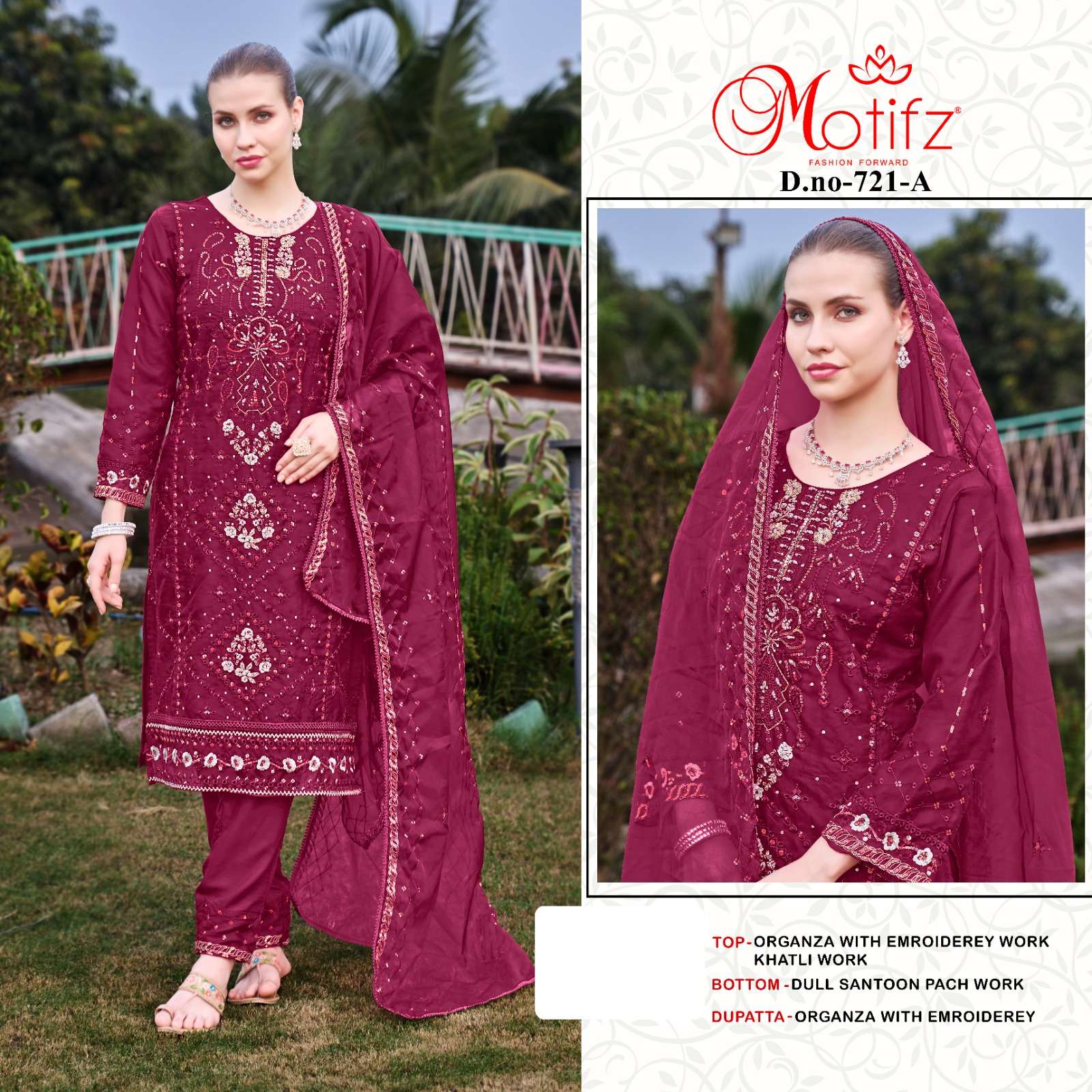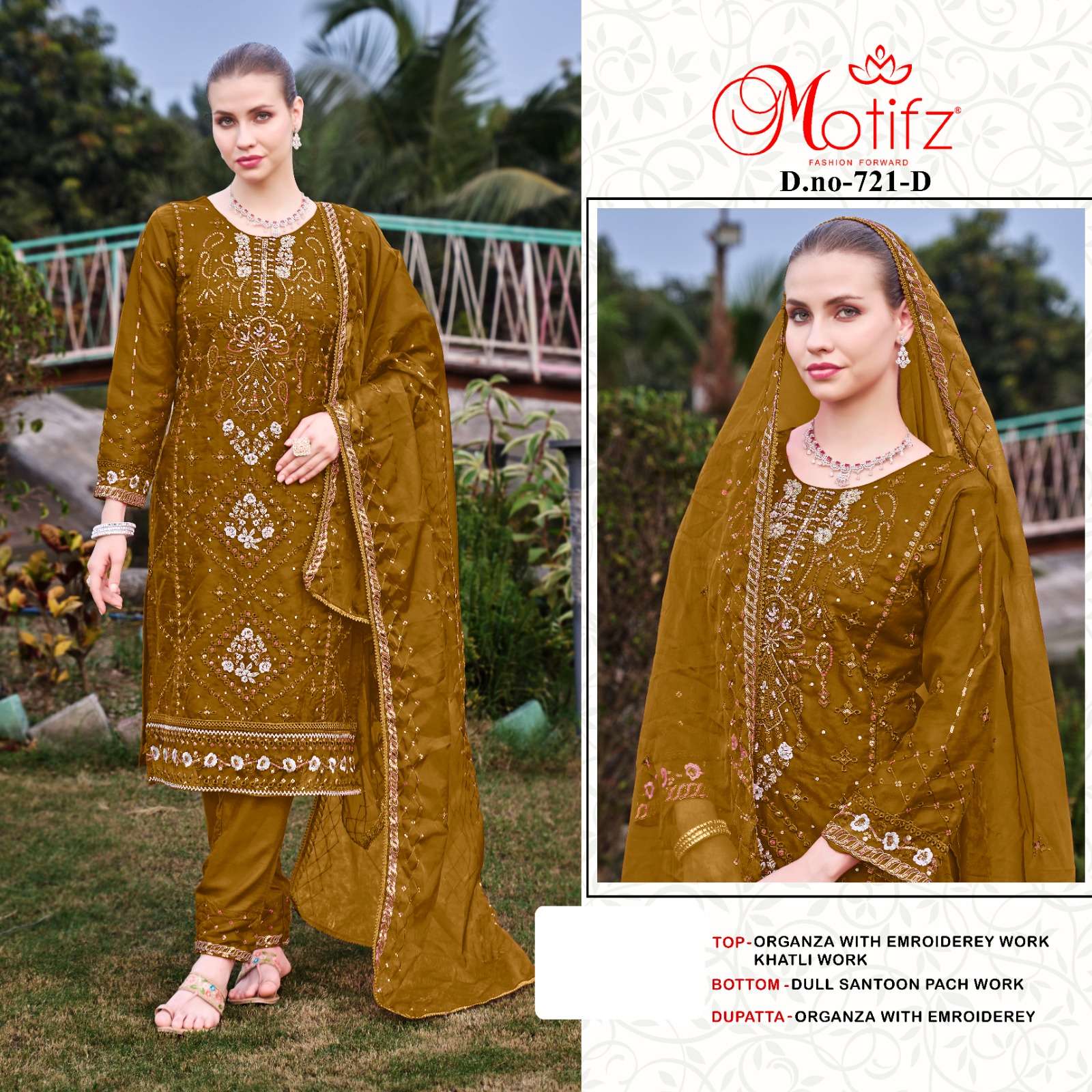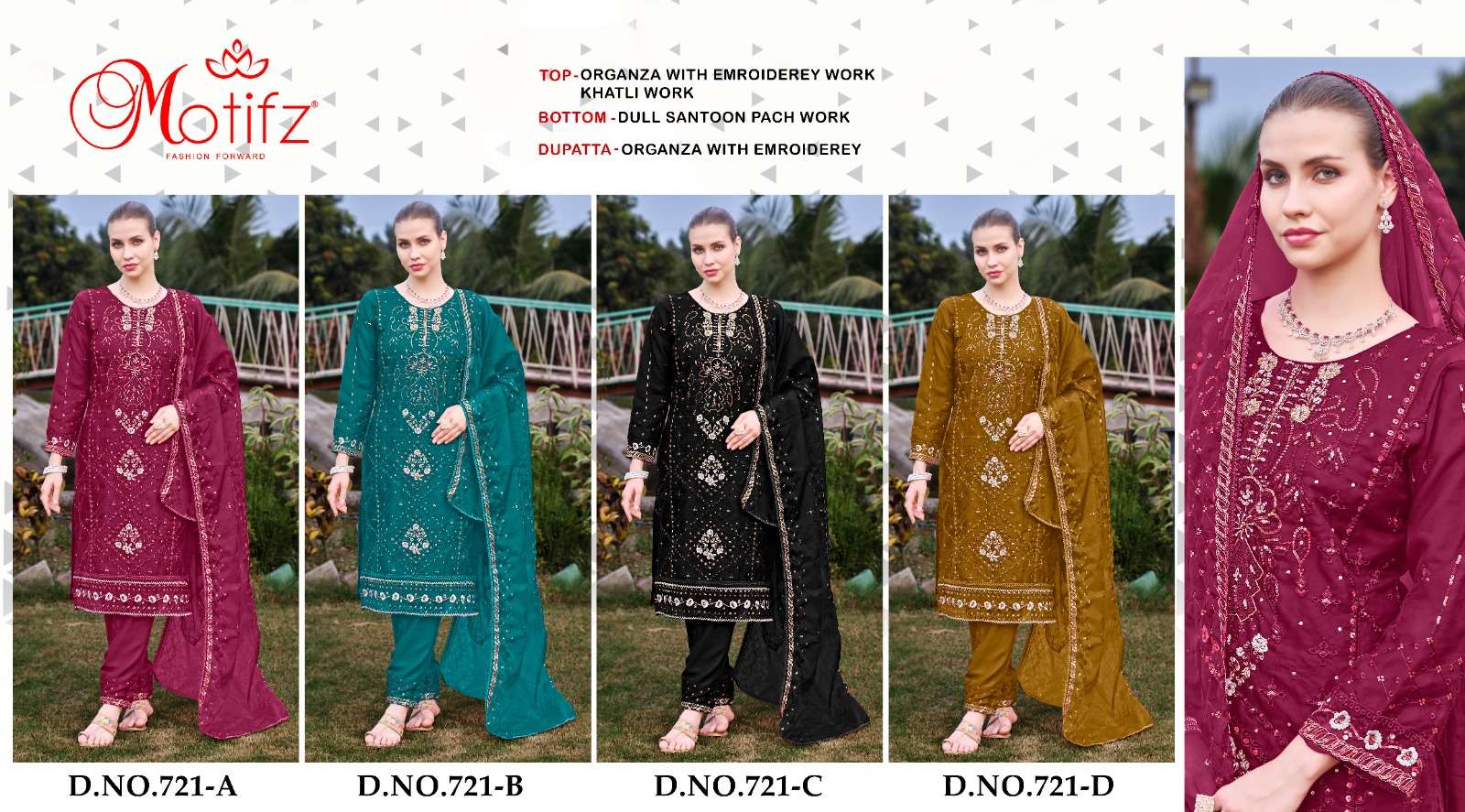 Design no 721 by Motifz organza suit collection manufacturer surat