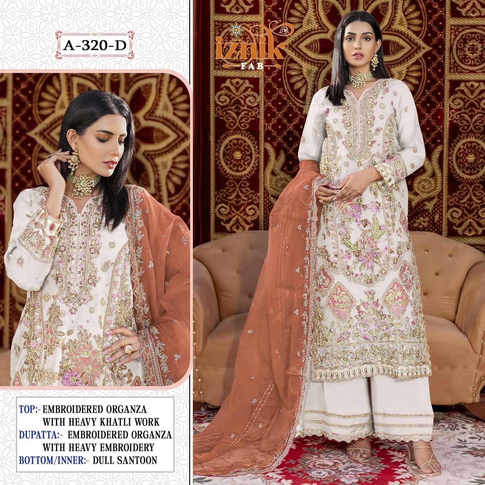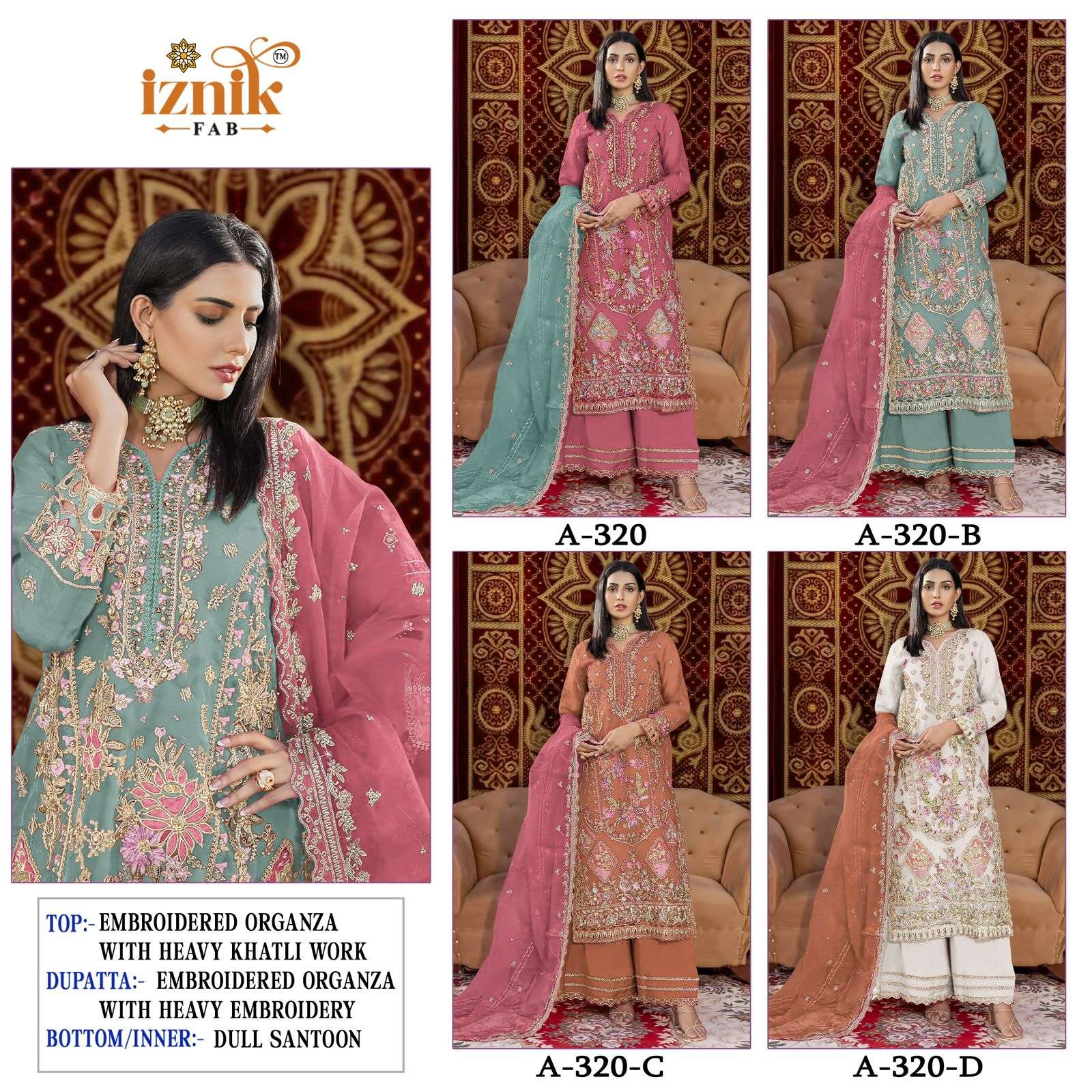 Buy Online DESIGN NO A 320 by IZNIK FAB suit collection manufacturer Surat 4 Pcs of Full Catalogue at Wholesale Price. Looking for DESIGN NO A 320 by IZNIK FAB suit collection manufacturer Surat Full Catalouge at Best Price? Buy Now DESIGN NO A 320 by IZNIK FAB suit collection manufacturer Surat at Wholesale Rate of Rs 5100 with Total 4 Pcs from authroized dealer and supplier of BRAND'S Brand. Cost of Each piece is just only Rs 1275 which is very low and affordable price to resale the product in your retail store ,This is Surat based Wholesale Supplier & Dealer of BRAND'S Brand. Click on Brand name to Know more about BRAND'S Brand's products.Call or Whatsapp on 9898838984 for booking or enquiry