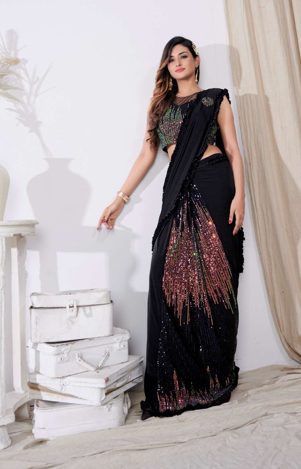*SAREE* IMPORTED(LYCRA) FABRIC WITH PLAIT IN SEQUIN WORK WITH ON PALLU BROOCH +LITTLE FRILL
