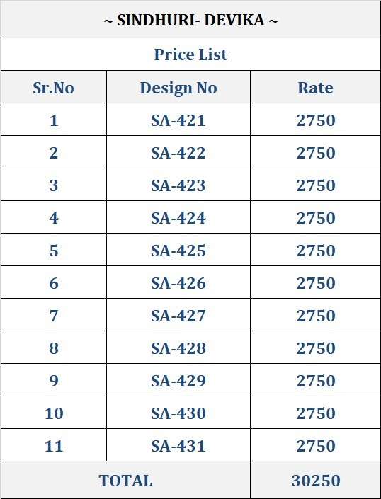 Buy Online Devika Series 421 TO 431 By Kimora saree collection manufacturer Surat 11 Pcs of Full Catalogue at Wholesale Price. Looking for Devika Series 421 TO 431 By Kimora saree collection manufacturer Surat Full Catalouge at Best Price? Buy Now Devika Series 421 TO 431 By Kimora saree collection manufacturer Surat at Wholesale Rate of Rs 0 with Total 11 Pcs from authroized dealer and supplier of KIMORA Brand. Cost of Each piece is just only Rs 0 which is very low and affordable price to resale the product in your retail store ,This is Surat based Wholesale Supplier & Dealer of KIMORA Brand. Click on Brand name to Know more about KIMORA Brand's products.Call or Whatsapp on 9898838984 for booking or enquiry