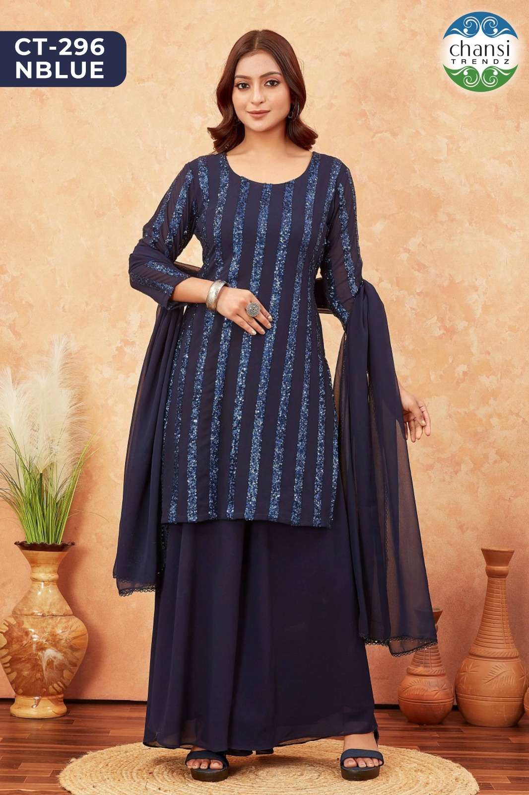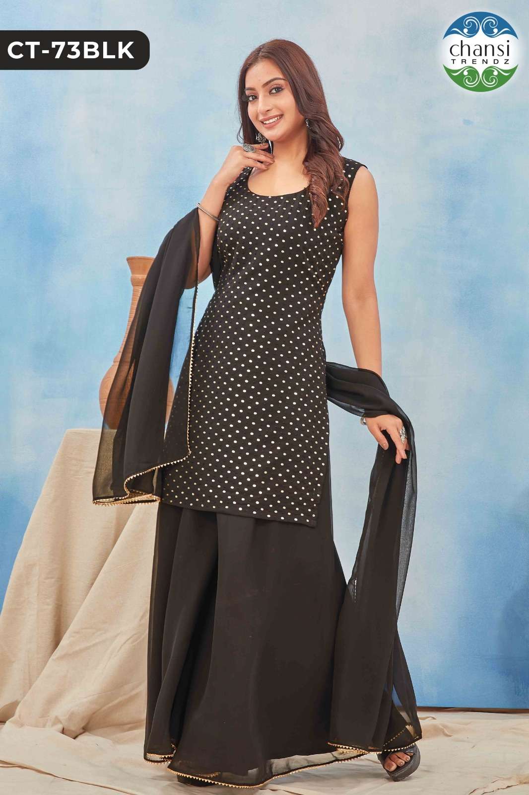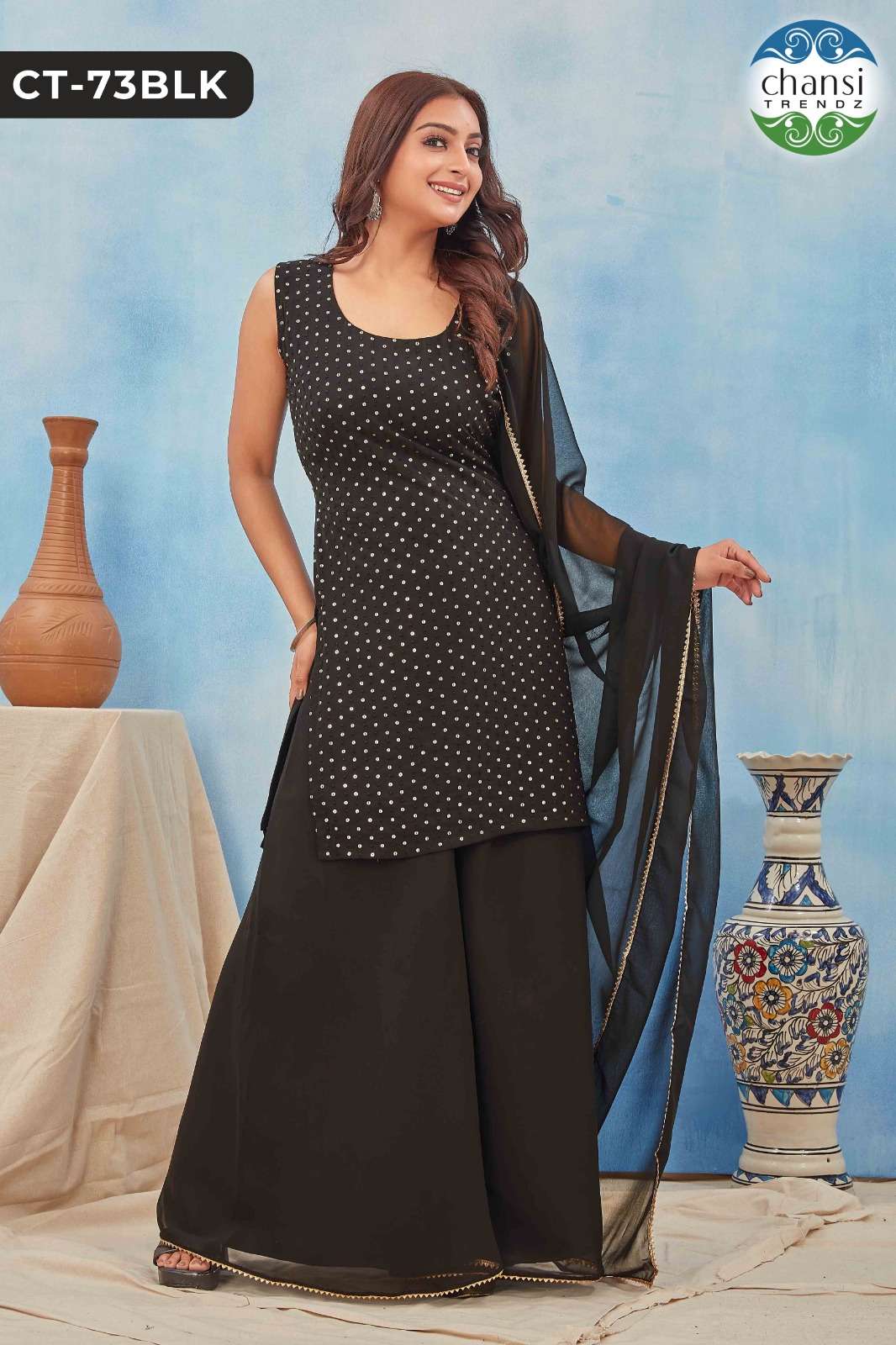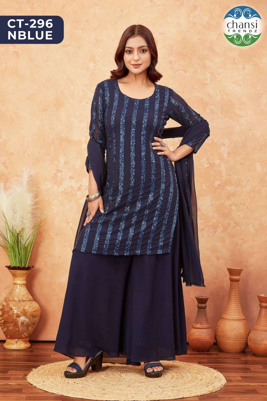 *Chansi Trendz* ®️ Presents *CATALOG NAME: DHAARANA* TOP FABRIC: GEORGETTE BOTTOM FABRIC: GEORGETTE DUPATTA FABRIC: GEORGETTE TOP TYPE: KURTA BOTTOM TYPE: PLAZZO CT-69: 1089+5%(GST) CT-73BLACK: 1079+5%(GST) CT-270PBLUE: 1379+5%(GST) CT-296NBLUE: 1599+5%(GST) *NO OF DESIGNS: 4-PCS* *SIZES: S, M, L, XL, XXL* STOCK: READY TO DISPATCH |