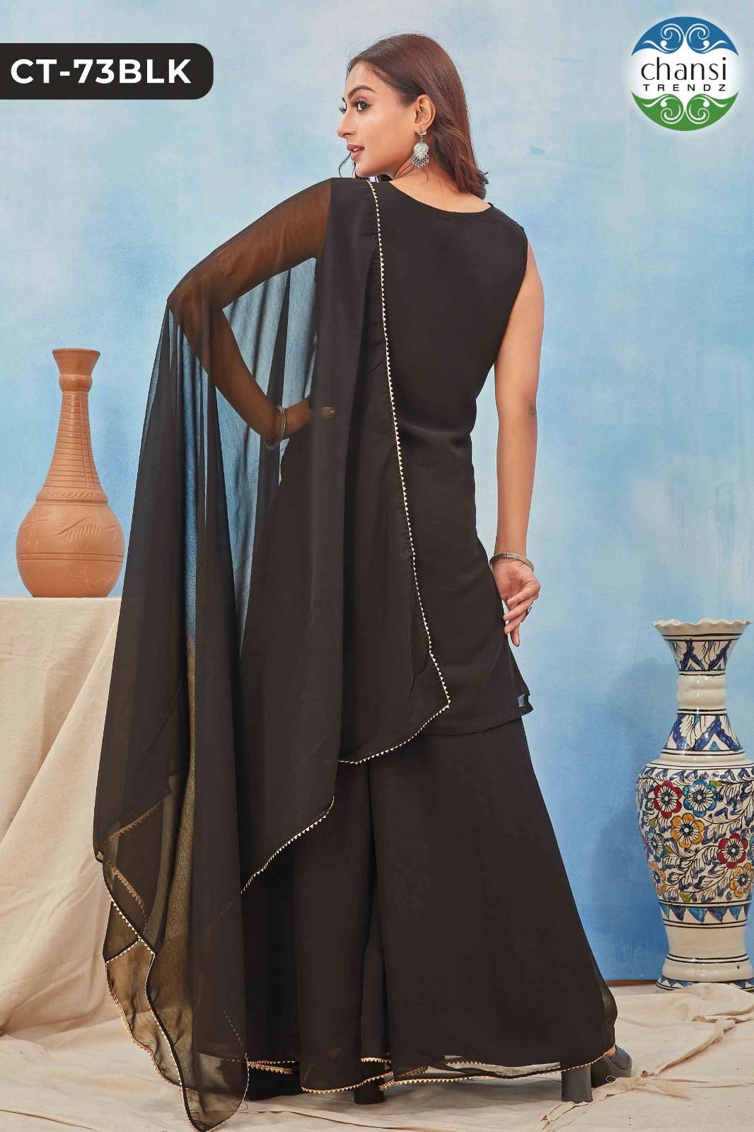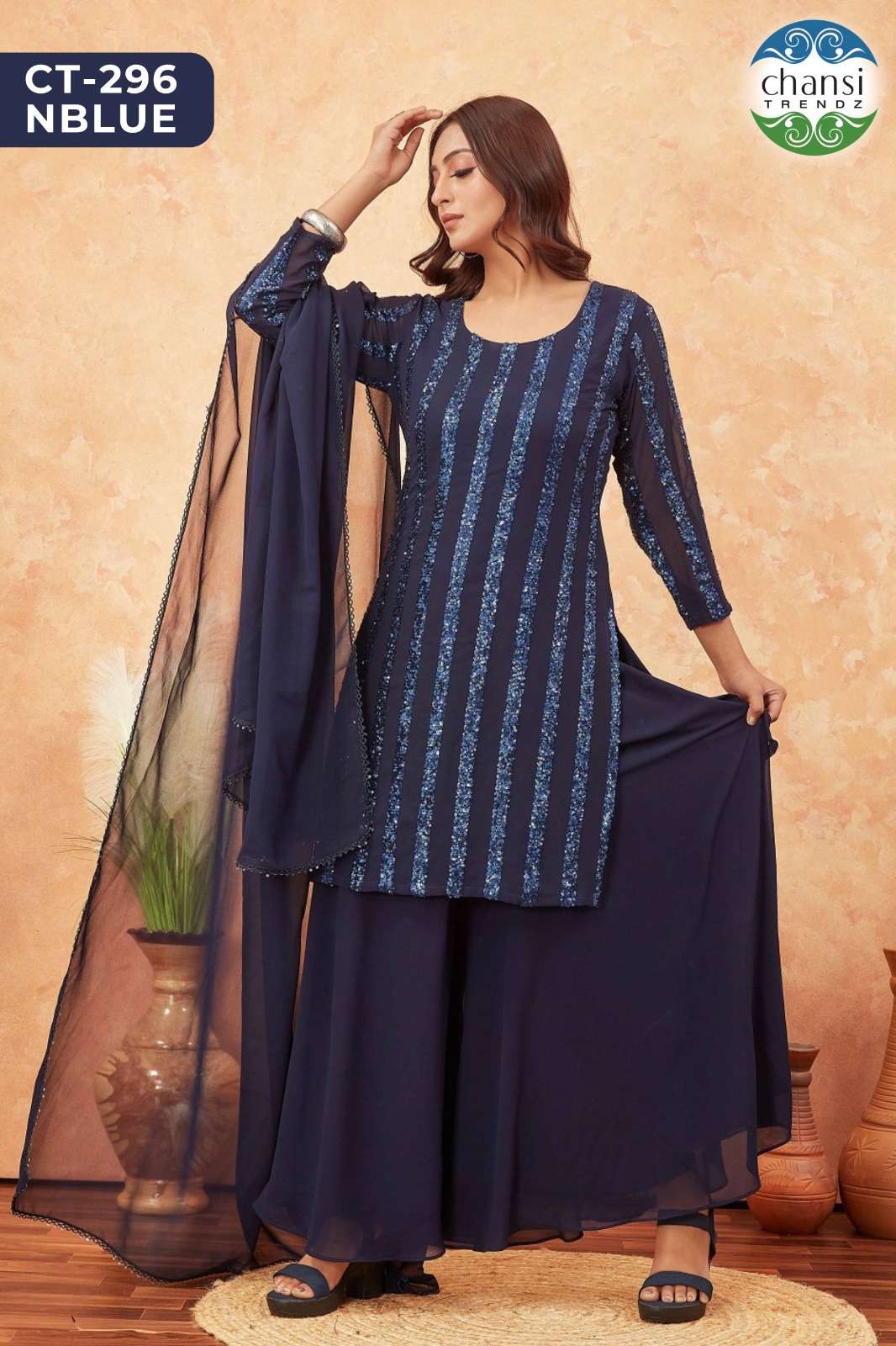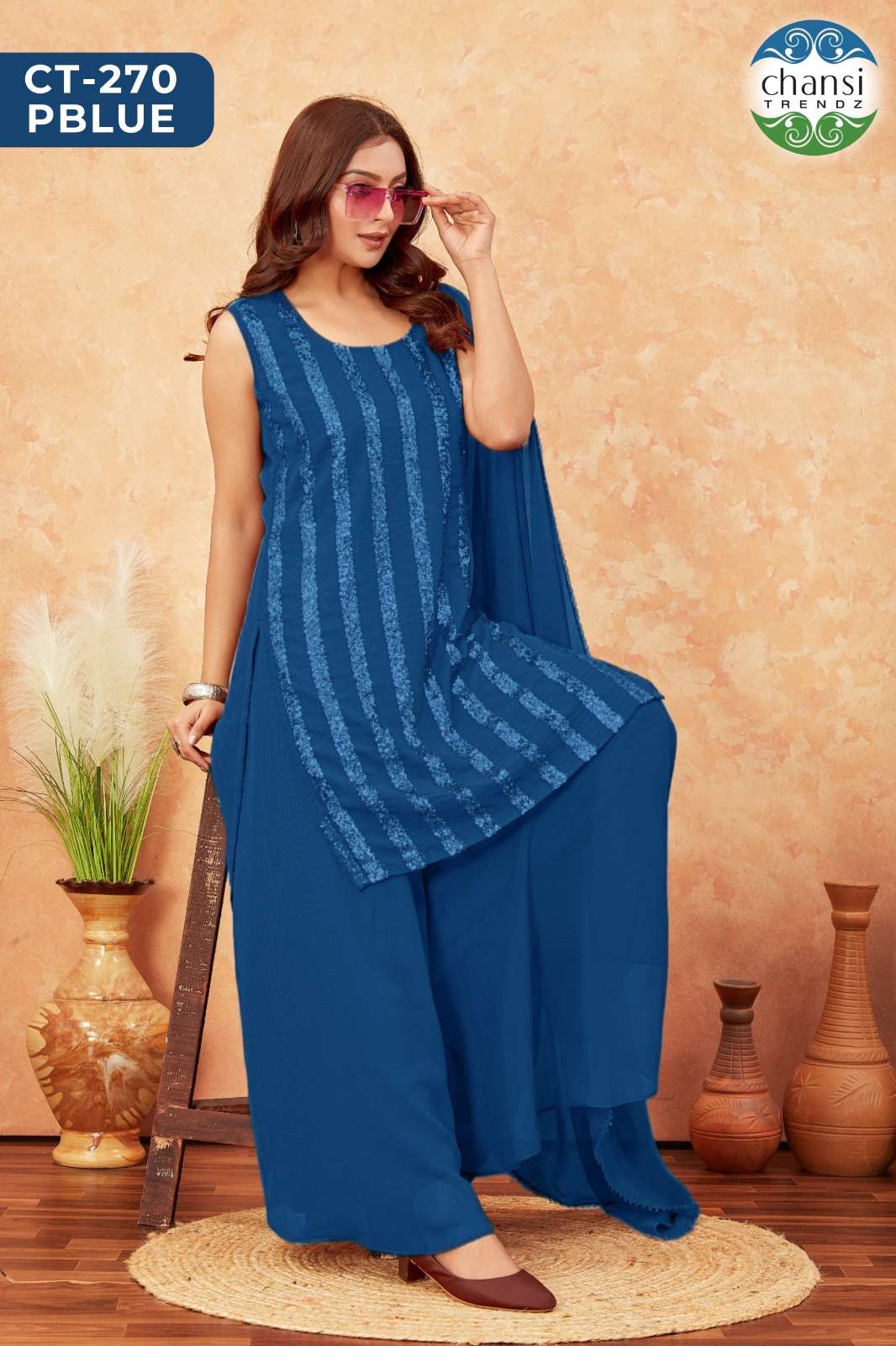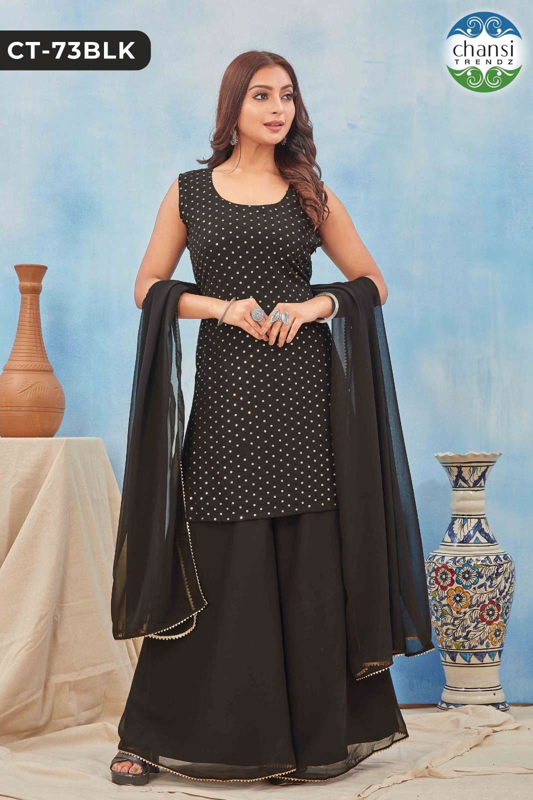 *Chansi Trendz* ®️ Presents *CATALOG NAME: DHAARANA* TOP FABRIC: GEORGETTE BOTTOM FABRIC: GEORGETTE DUPATTA FABRIC: GEORGETTE TOP TYPE: KURTA BOTTOM TYPE: PLAZZO CT-69: 1089+5%(GST) CT-73BLACK: 1079+5%(GST) CT-270PBLUE: 1379+5%(GST) CT-296NBLUE: 1599+5%(GST) *NO OF DESIGNS: 4-PCS* *SIZES: S, M, L, XL, XXL* STOCK: READY TO DISPATCH |