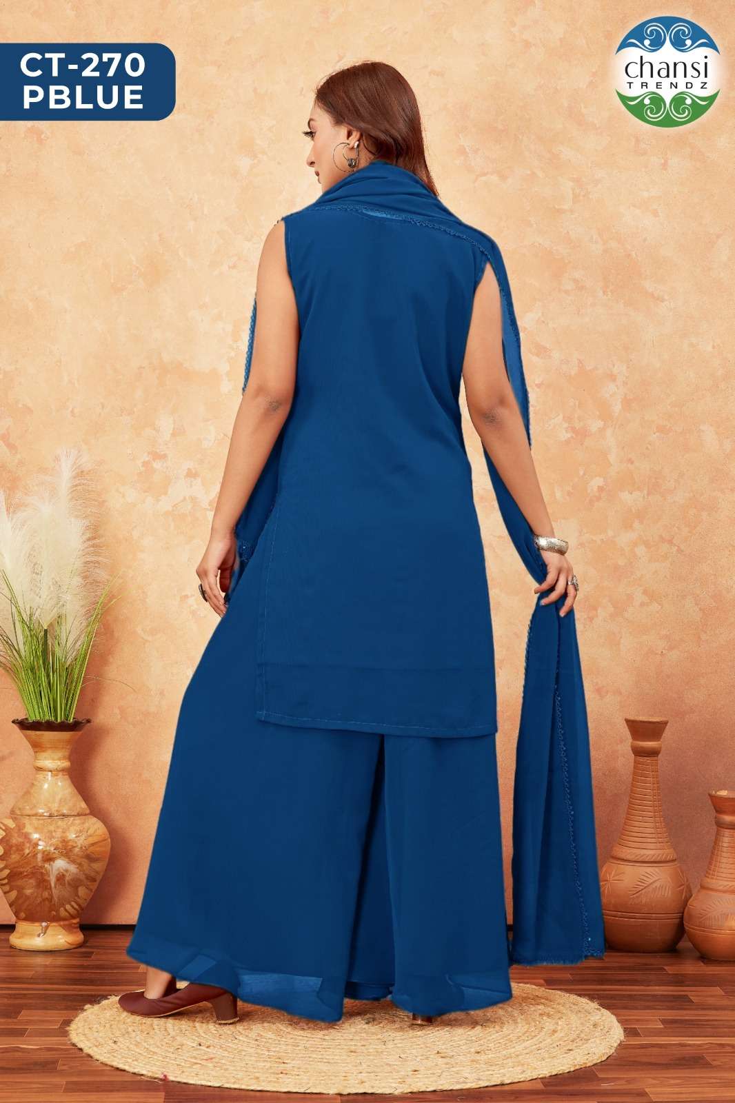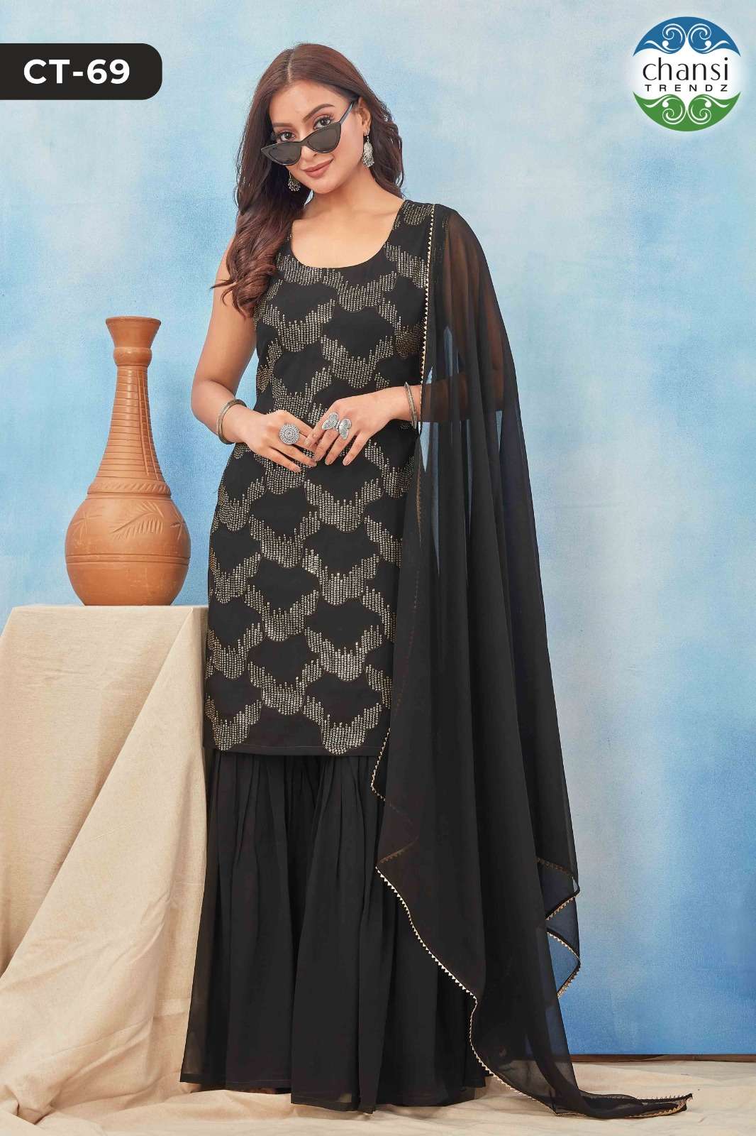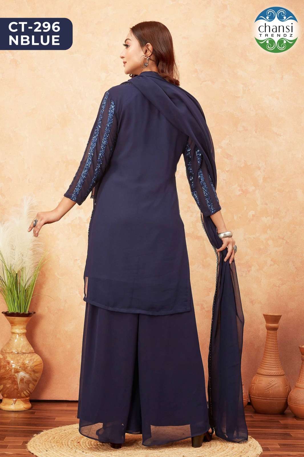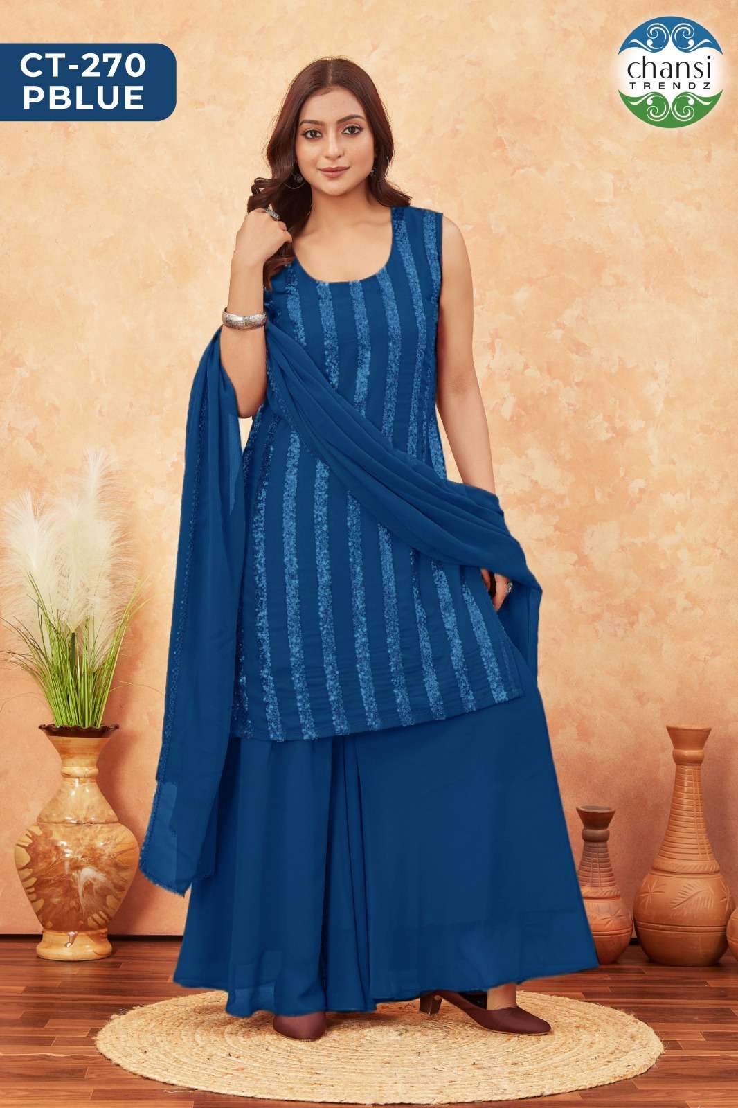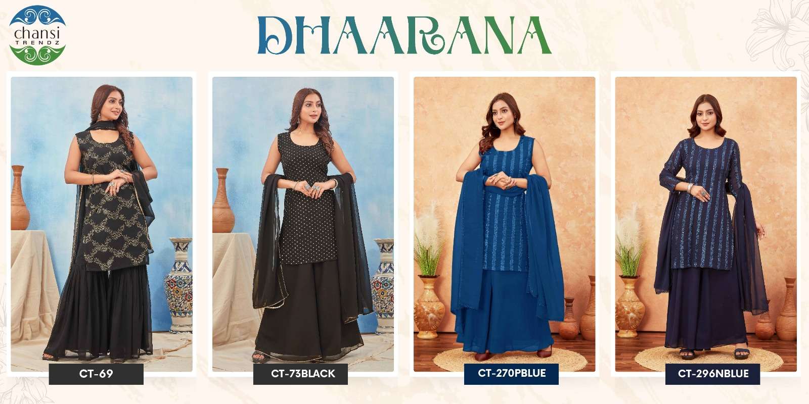 *Chansi Trendz* ®️ Presents *CATALOG NAME: DHAARANA* TOP FABRIC: GEORGETTE BOTTOM FABRIC: GEORGETTE DUPATTA FABRIC: GEORGETTE TOP TYPE: KURTA BOTTOM TYPE: PLAZZO CT-69: 1089+5%(GST) CT-73BLACK: 1079+5%(GST) CT-270PBLUE: 1379+5%(GST) CT-296NBLUE: 1599+5%(GST) *NO OF DESIGNS: 4-PCS* *SIZES: S, M, L, XL, XXL* STOCK: READY TO DISPATCH |