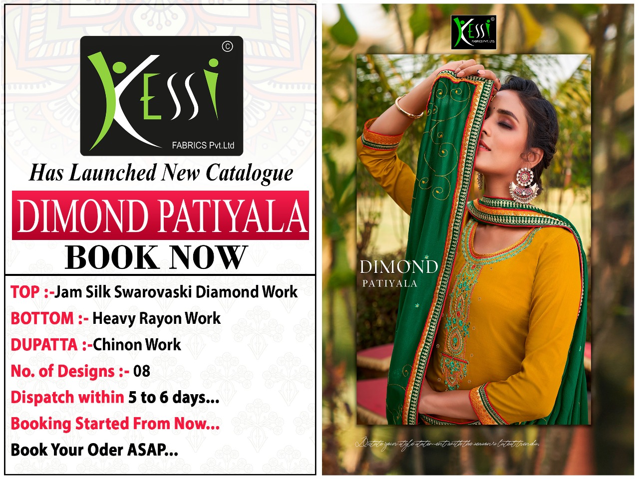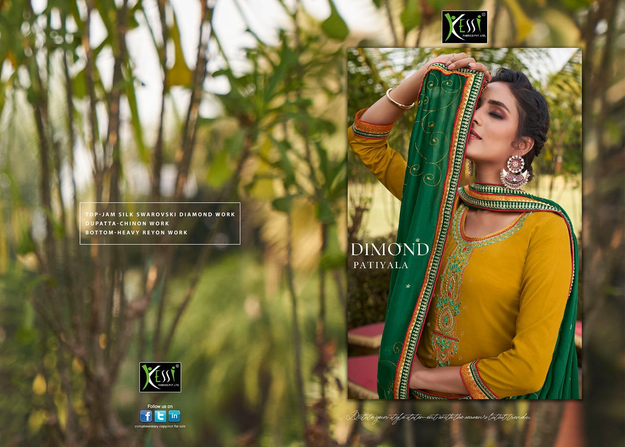 ? Kessi Fabrics Pvt. Ltd. has launched Catalog name : *DIAMOND PATIYALA* ? Fabric Details ? ?Top:- Jam silk WITH SWAROVSKI DIAMOND Work ( 2.5 MTR cut ) ?Bottom:- Heavy Rayon with Work ( 3 MTR cut ) ?Dupatta:- Chinon with Work ( 2.25 MTR cut ) Rate - 899/- Set to set ?Total Design:- 8 ?Dispatching 5 to 6 days later ?Booking started from now... ?Order yours soon.... |