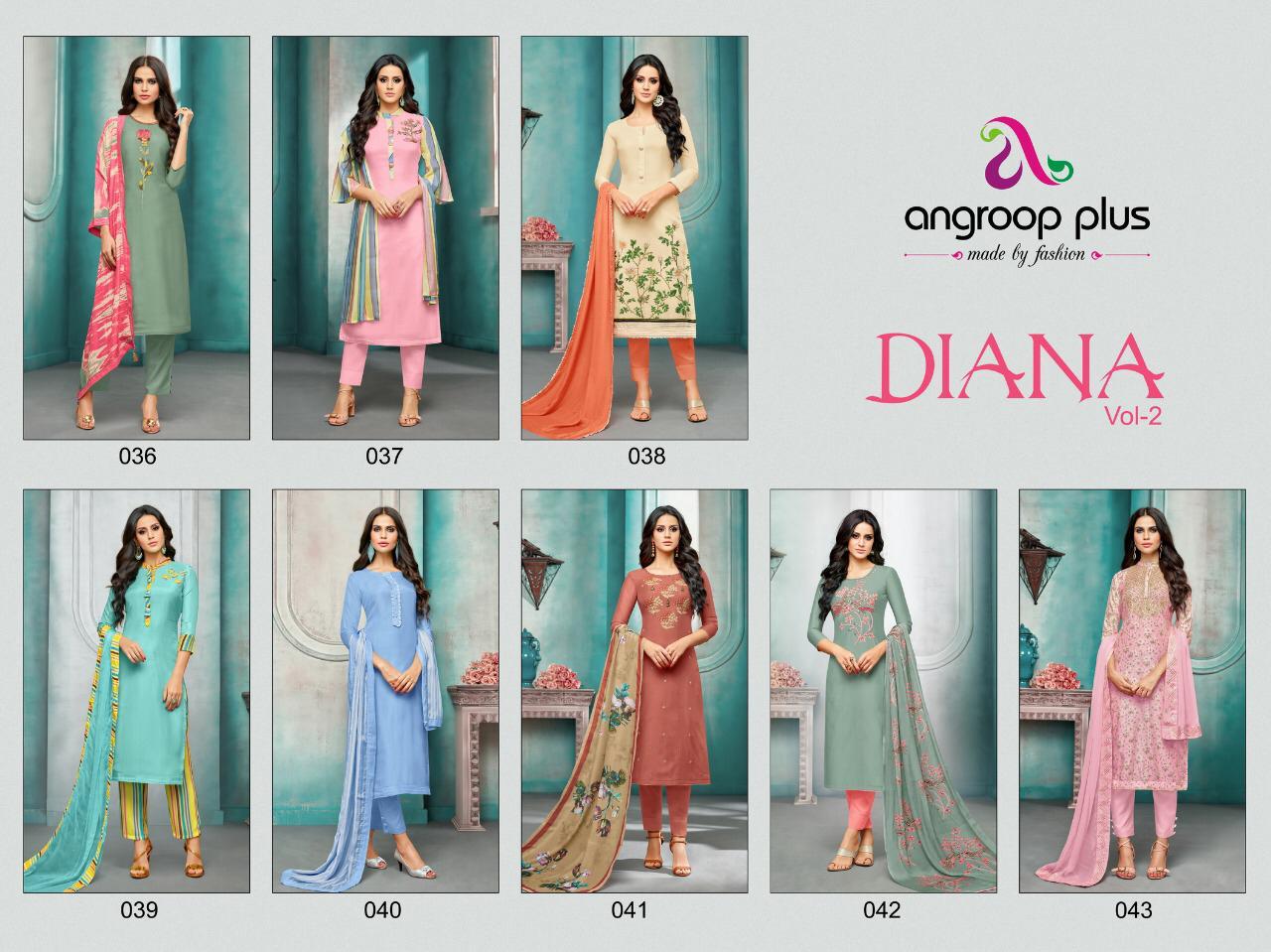 Buy Online Diana Vol 2 By Angroop Plus 036 Series Fancy Maslin Silk Embroidery Salwar Kameez Catlog Wholesale Supplier Surat 8 Pcs of Full Catalogue at Wholesale Price. Looking for Diana Vol 2 By Angroop Plus 036 Series Fancy Maslin Silk Embroidery Salwar Kameez Catlog Wholesale Supplier Surat Full Catalouge at Best Price? Buy Now Diana Vol 2 By Angroop Plus 036 Series Fancy Maslin Silk Embroidery Salwar Kameez Catlog Wholesale Supplier Surat at Wholesale Rate of Rs 5400 with Total 8 Pcs from authroized dealer and supplier of ANGROOP PLUS Brand. Cost of Each piece is just only Rs 675 which is very low and affordable price to resale the product in your retail store ,This is Surat based Wholesale Supplier & Dealer of ANGROOP PLUS Brand. Click on Brand name to Know more about ANGROOP PLUS Brand's products.Call or Whatsapp on 9898838984 for booking or enquiry