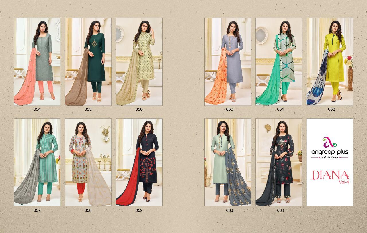 Buy Online Diana Vol 4 By Angroop Plus 054 Series Fancy Maslin Silk Digital Printed Salwar Kameez Catlog Wholesaler Surat 11 Pcs of Full Catalogue at Wholesale Price. Looking for Diana Vol 4 By Angroop Plus 054 Series Fancy Maslin Silk Digital Printed Salwar Kameez Catlog Wholesaler Surat Full Catalouge at Best Price? Buy Now Diana Vol 4 By Angroop Plus 054 Series Fancy Maslin Silk Digital Printed Salwar Kameez Catlog Wholesaler Surat at Wholesale Rate of Rs 7425 with Total 11 Pcs from authroized dealer and supplier of ANGROOP PLUS Brand. Cost of Each piece is just only Rs 675 which is very low and affordable price to resale the product in your retail store ,This is Surat based Wholesale Supplier & Dealer of ANGROOP PLUS Brand. Click on Brand name to Know more about ANGROOP PLUS Brand's products.Call or Whatsapp on 9898838984 for booking or enquiry