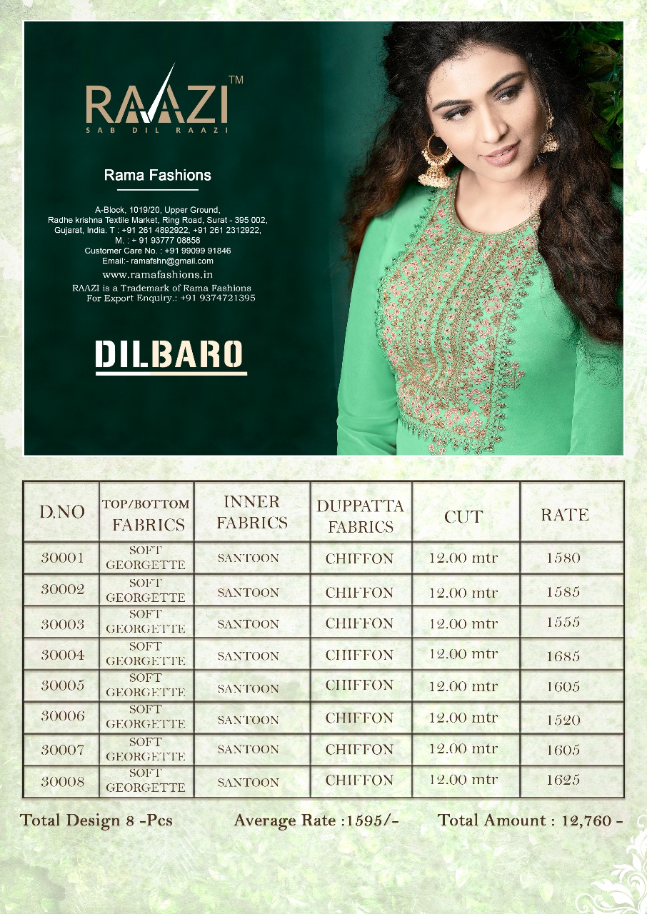 Buy Online Dilbaro By Rama Raazi 30001 Series Designer Party Wear Sarara Suit Catlog Wholesale Dealer And Supplier Surat 8 Pcs of Full Catalogue at Wholesale Price. Looking for Dilbaro By Rama Raazi 30001 Series Designer Party Wear Sarara Suit Catlog Wholesale Dealer And Supplier Surat Full Catalouge at Best Price? Buy Now Dilbaro By Rama Raazi 30001 Series Designer Party Wear Sarara Suit Catlog Wholesale Dealer And Supplier Surat at Wholesale Rate of Rs 12760 with Total 8 Pcs from authroized dealer and supplier of Brand. Cost of Each piece is just only Rs 1595 which is very low and affordable price to resale the product in your retail store ,This is Surat based Wholesale Supplier & Dealer of Brand. Click on Brand name to Know more about Brand's products.Call or Whatsapp on 9898838984 for booking or enquiry