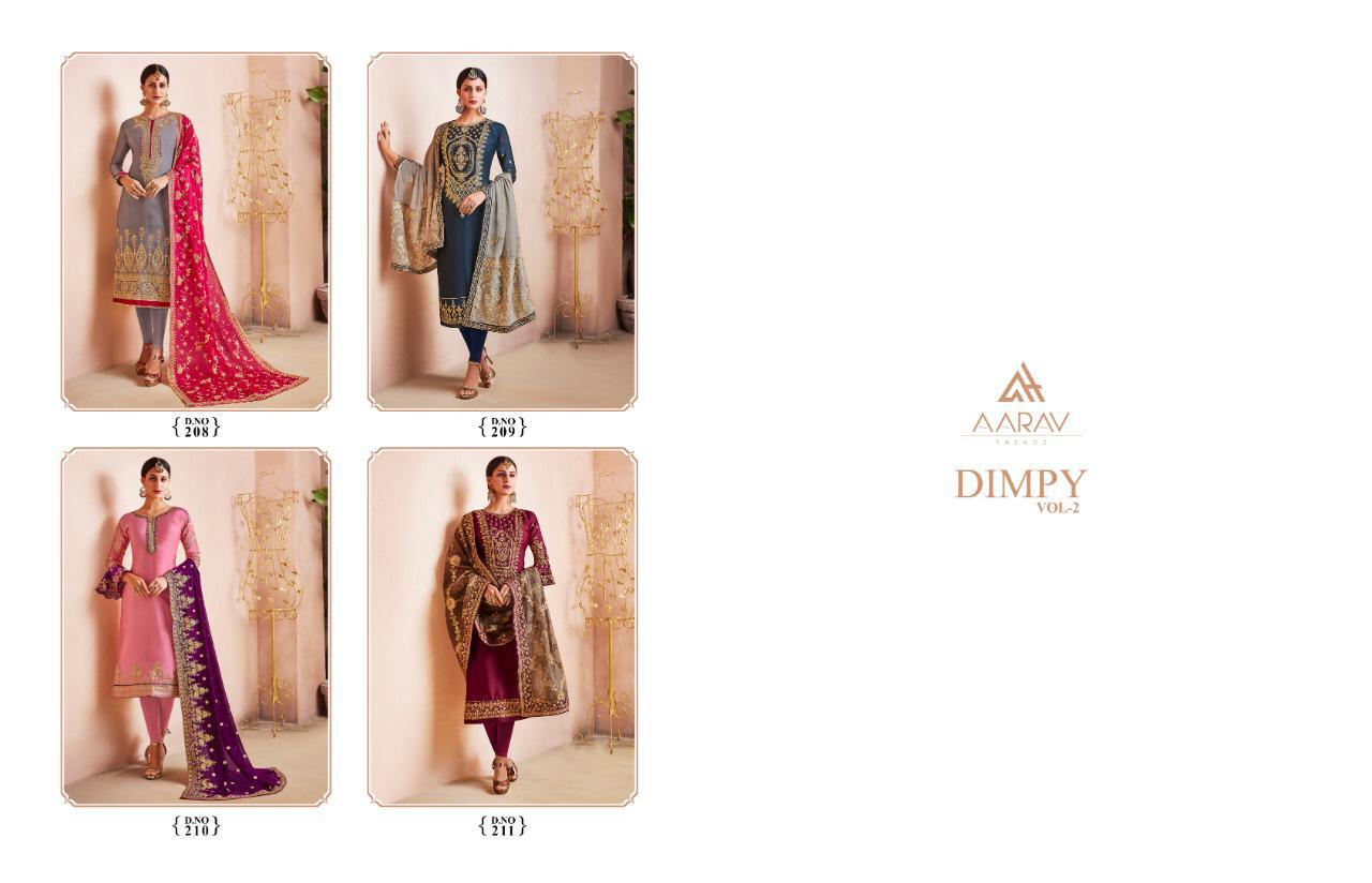AARAV trendz We are presenting our new catlog by name DIMPY vol 2 fabric details below Top- Real jorjet satin 3.5mtr Bottom-Heavy santoon 2.5 mtr Inner- Heavy santoon 2.25 mtr Dupata-Real jorjet/ organza with elegant embroidery 2.25 mtr Total design - 4 Price- 1599/- Dispatch on 9.2.19 Limited stock Gst extra |