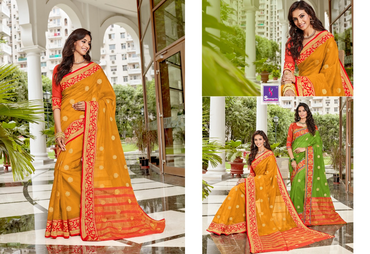 Buy Online Disha Cotton By Shangrila 4031 Series Weaving Silk Saree Catlog Wholesale Supplier Surat 12 Pcs of Full Catalogue at Wholesale Price. Looking for Disha Cotton By Shangrila 4031 Series Weaving Silk Saree Catlog Wholesale Supplier Surat Full Catalouge at Best Price? Buy Now Disha Cotton By Shangrila 4031 Series Weaving Silk Saree Catlog Wholesale Supplier Surat at Wholesale Rate of Rs 7500 with Total 12 Pcs from authroized dealer and supplier of SHANGRILA Brand. Cost of Each piece is just only Rs 625 which is very low and affordable price to resale the product in your retail store ,This is Surat based Wholesale Supplier & Dealer of SHANGRILA Brand. Click on Brand name to Know more about SHANGRILA Brand's products.Call or Whatsapp on 9898838984 for booking or enquiry
