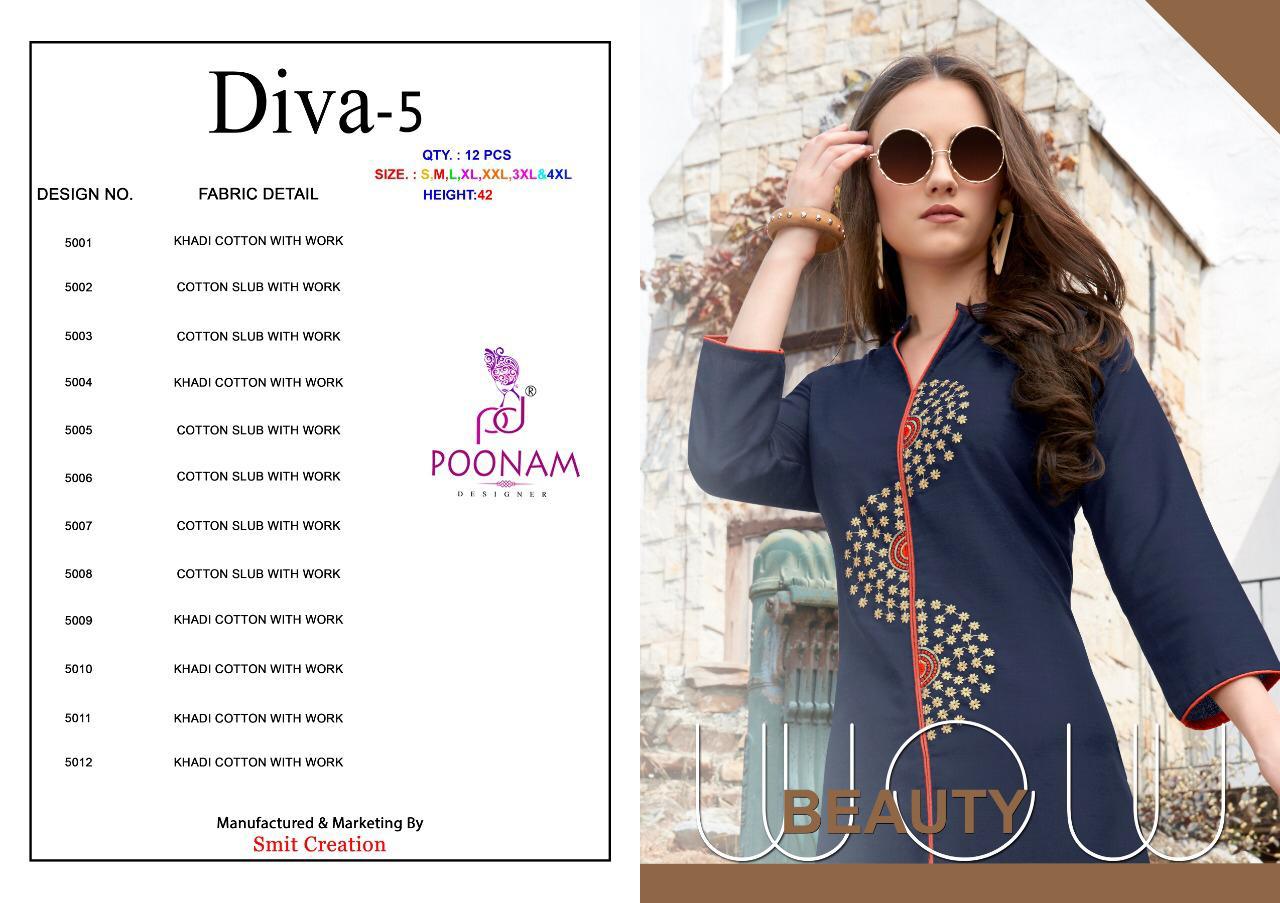 Buy Online Diva Vol 5 By Poonam Designer Cotton Embroidered Designer Kurtis Wholesale Supplier And Dealer Gujarat 12 Pcs of Full Catalogue at Wholesale Price. Looking for Diva Vol 5 By Poonam Designer Cotton Embroidered Designer Kurtis Wholesale Supplier And Dealer Gujarat Full Catalouge at Best Price? Buy Now Diva Vol 5 By Poonam Designer Cotton Embroidered Designer Kurtis Wholesale Supplier And Dealer Gujarat at Wholesale Rate of Rs 3000 with Total 12 Pcs from authroized dealer and supplier of Poonam designer Brand. Cost of Each piece is just only Rs 250 which is very low and affordable price to resale the product in your retail store ,This is Surat based Wholesale Supplier & Dealer of Poonam designer Brand. Click on Brand name to Know more about Poonam designer Brand's products.Call or Whatsapp on 9898838984 for booking or enquiry