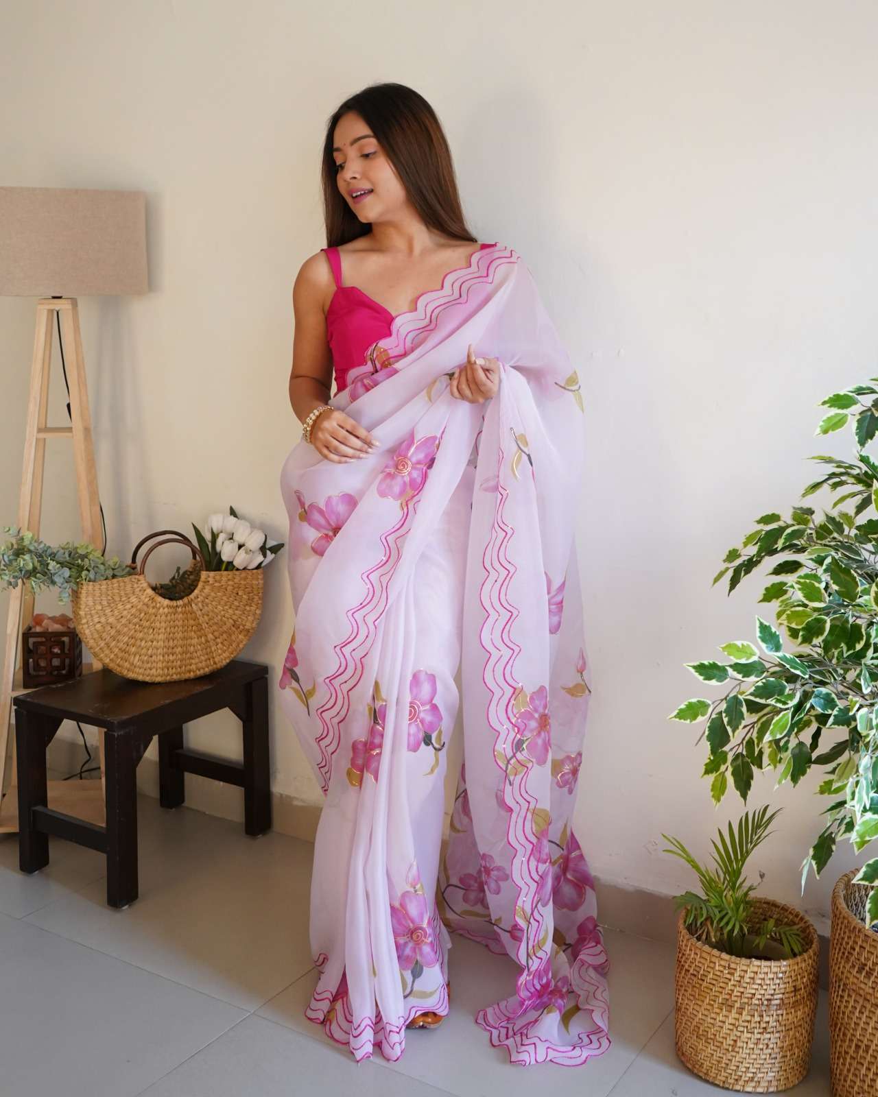 Catalog Name : *DIVISHA* No of Pcs : 2 Fabric :-Organza Work :- Digital Print Print or Pattern Type – Flower Printed Occasion - Traditional, Party, Wedding Border Arco CutworkBlouse Fabric - Satin Plain