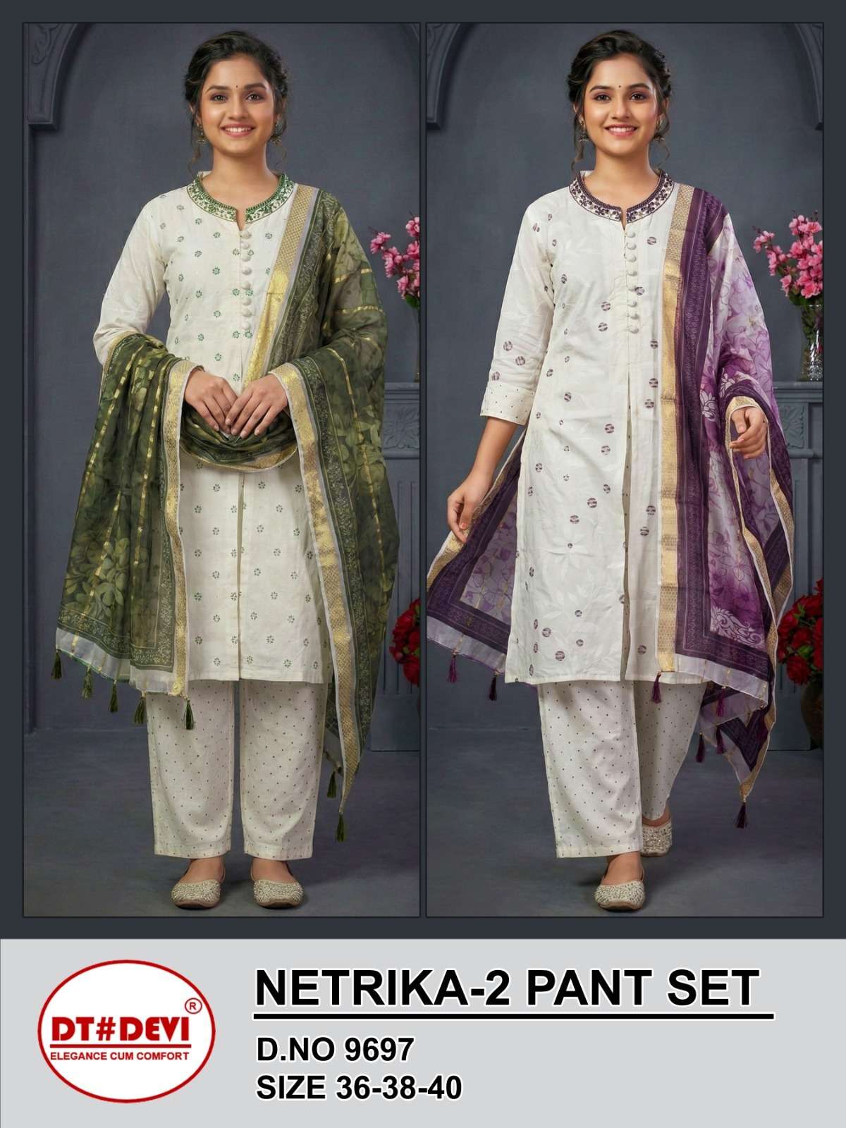 🌟 D.NO 9697 🌟NETRIKA-2 PANT SET 🌟SIZE - 36-38-40 🌟COLOURS - 2 🌟1 SET - 6 PCS 🌟FABRIC TOP & BOTTOM - ROMAN SILK WITH DIGITAL DUPATTA 🌟RATE - 685/- 🌟EMBROIDERY WORK IN COLLAR
