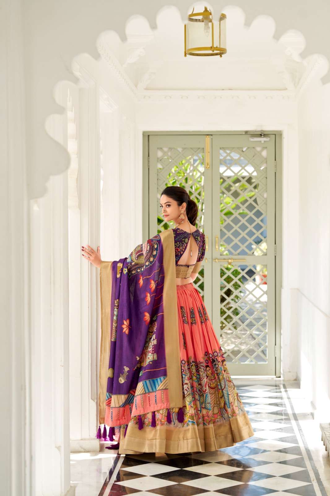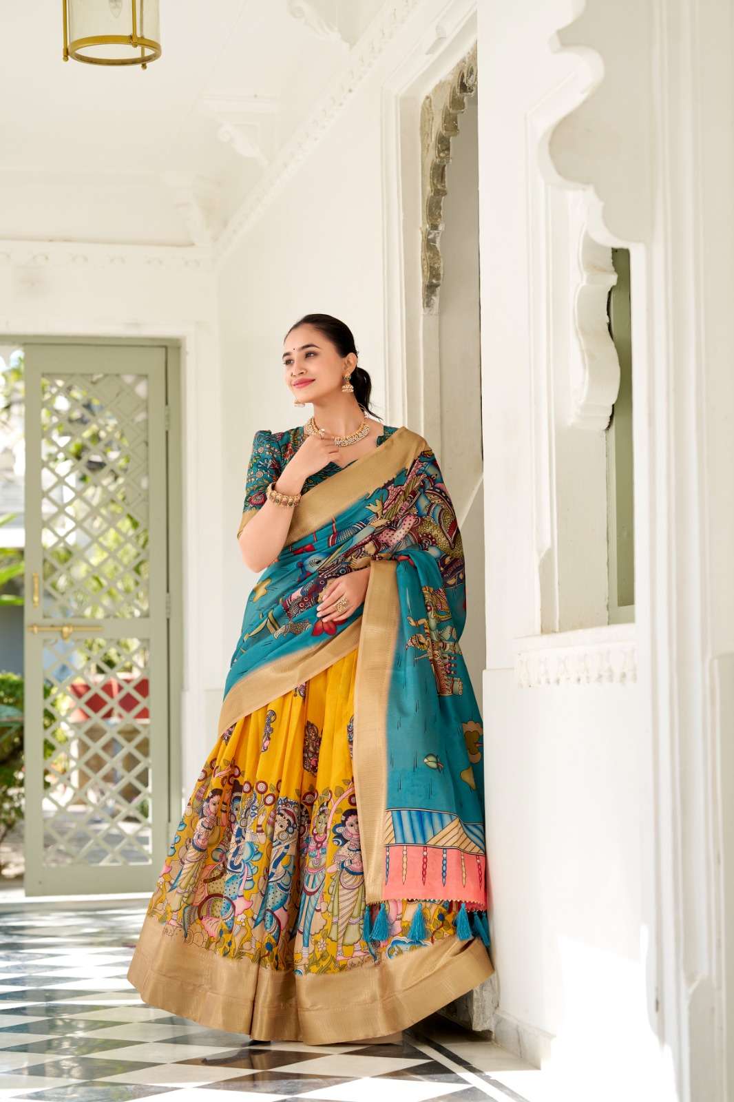 Adorned in the elegance of Dola Silk and the intricate charm of Kalamkari prints, the lehenga choli whispers tales of tradition and beauty💐.