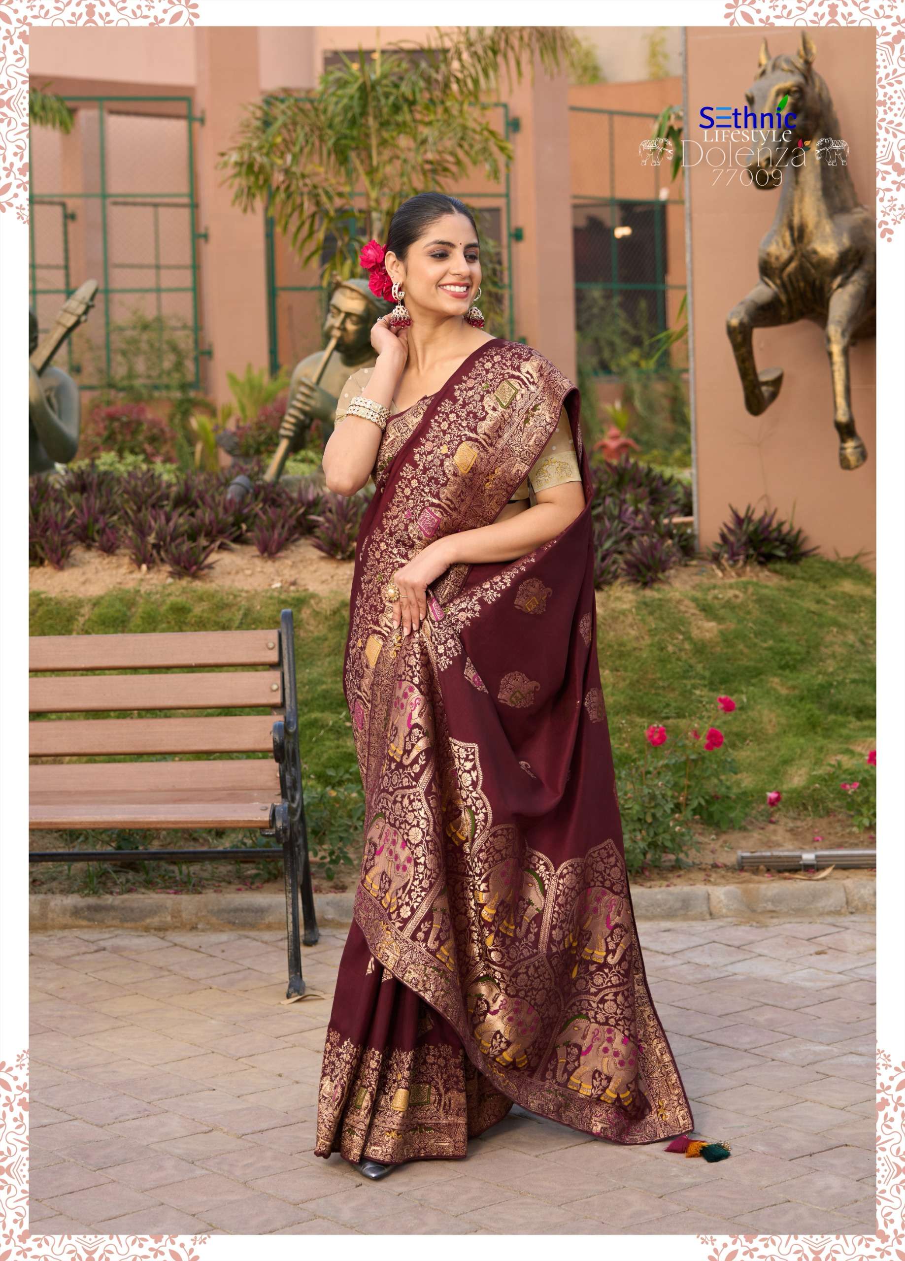 Buy Online Dolenza Vol 2 by Sethnic Lifestyle Pure Dola Silk saree collection manufacturer surat 5 Pcs of Full Catalogue at Wholesale Price. Looking for Dolenza Vol 2 by Sethnic Lifestyle Pure Dola Silk saree collection manufacturer surat Full Catalouge at Best Price? Buy Now Dolenza Vol 2 by Sethnic Lifestyle Pure Dola Silk saree collection manufacturer surat at Wholesale Rate of Rs 7975 with Total 5 Pcs from authroized dealer and supplier of SETHNIC LIFESTYLE Brand. Cost of Each piece is just only Rs 1595 which is very low and affordable price to resale the product in your retail store ,This is Surat based Wholesale Supplier & Dealer of SETHNIC LIFESTYLE Brand. Click on Brand name to Know more about SETHNIC LIFESTYLE Brand's products.Call or Whatsapp on 9898838984 for booking or enquiry