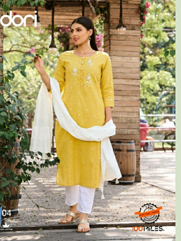 *Brand :* 100 miles *Catalog Name :* Dori Top Pant With Dupatta *Price :* ?905 *Piece :* 4 *Total Price :* 3620 ( GST Extra ) *Size :* S,M,L,XL,XXL,XXXL *Fabric :* silver butti cotton *Availibility :* On Booking |