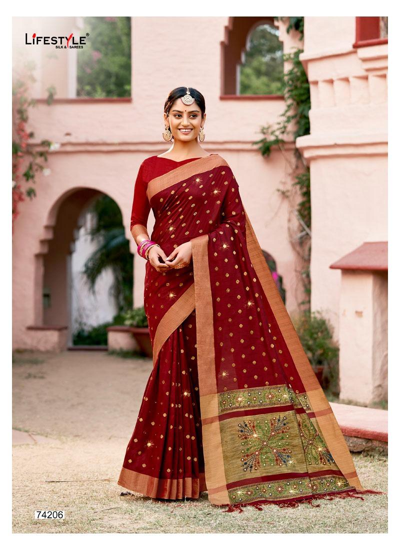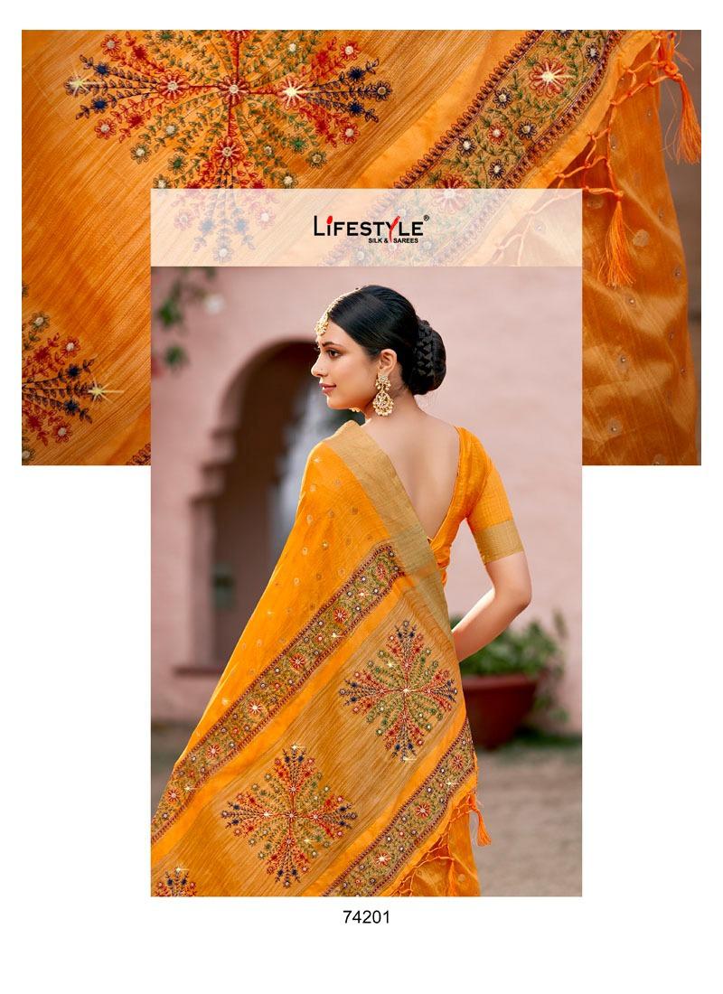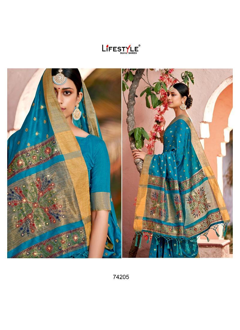 Brand = *LIFESTYLE* Catalog :- *DOSTANA* Volume :- 1 Fabric :- *CRYSTAL SILK* Packing :- BOX Ex-mill Price :- *1117/-* per pcs Set to set Cut/Length :- 6.4 FANCY CRYSTAL SILK SAREE WITH EMBROIDERY PALLU WORK AND DIAMOND PACKING -today |