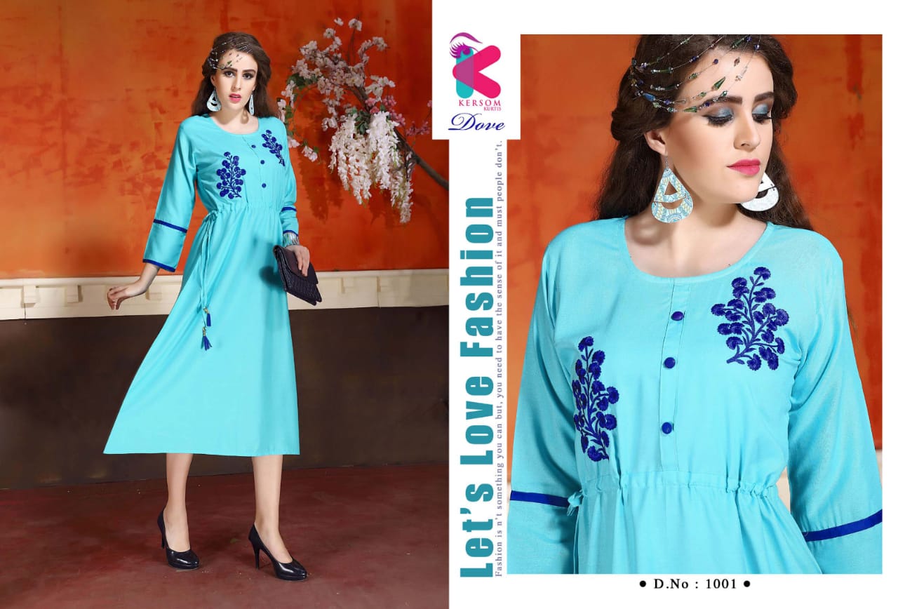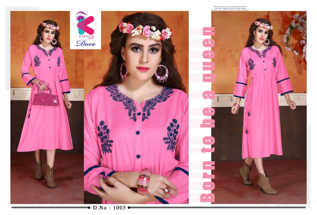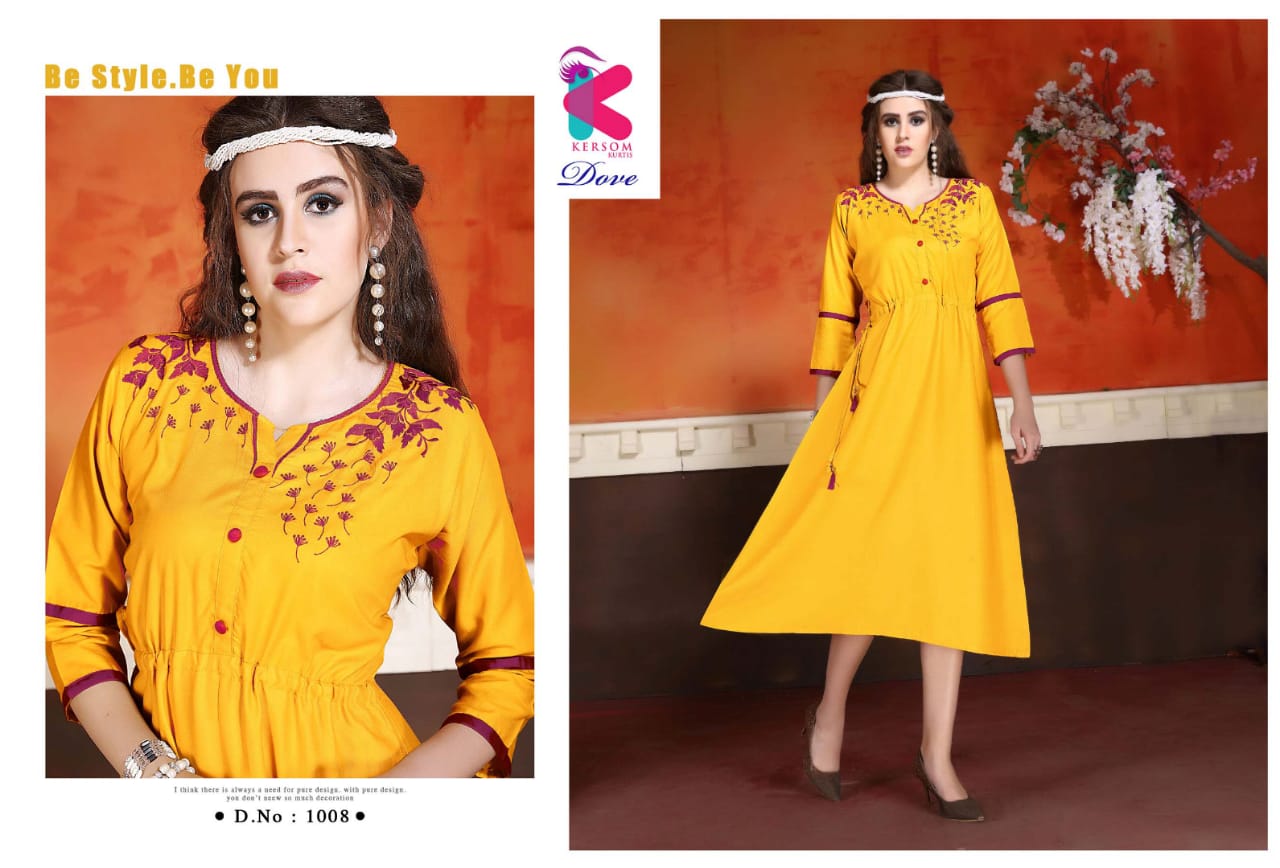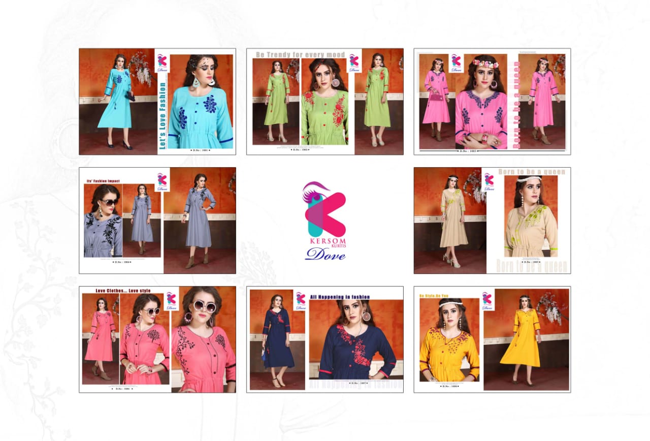 Buy Online Dove By Kersome 1001 Series Heavy Reyon Kurti Collection Wholesaler Surat 8 Pcs of Full Catalogue at Wholesale Price. Looking for Dove By Kersome 1001 Series Heavy Reyon Kurti Collection Wholesaler Surat Full Catalouge at Best Price? Buy Now Dove By Kersome 1001 Series Heavy Reyon Kurti Collection Wholesaler Surat at Wholesale Rate of Rs 3760 with Total 8 Pcs from authroized dealer and supplier of Kersom kurtis Brand. Cost of Each piece is just only Rs 470 which is very low and affordable price to resale the product in your retail store ,This is Surat based Wholesale Supplier & Dealer of Kersom kurtis Brand. Click on Brand name to Know more about Kersom kurtis Brand's products.Call or Whatsapp on 9898838984 for booking or enquiry