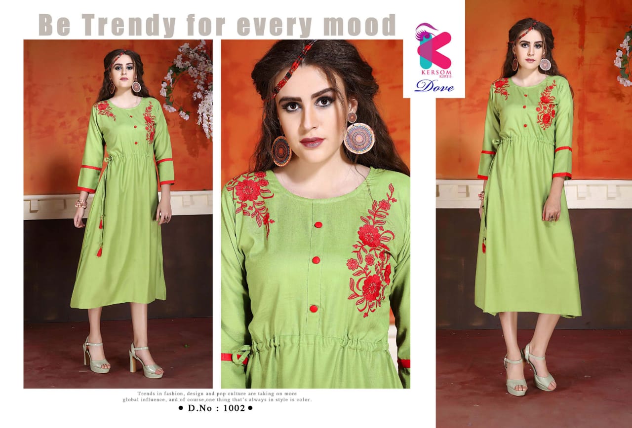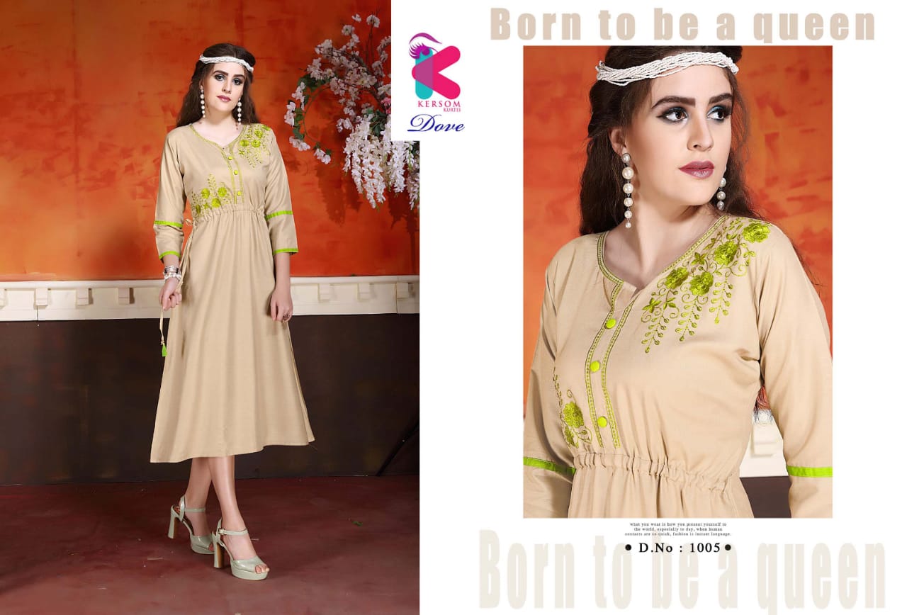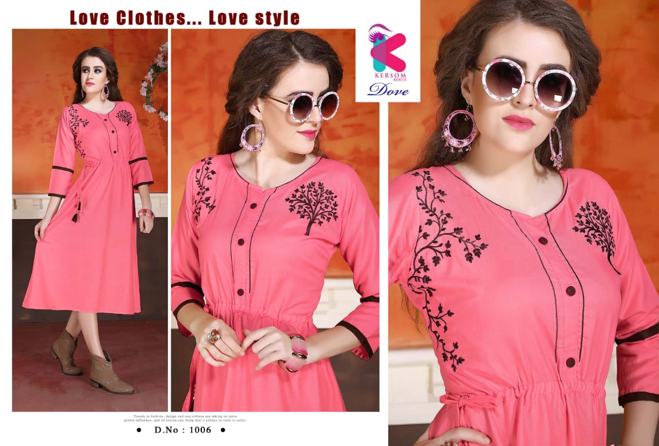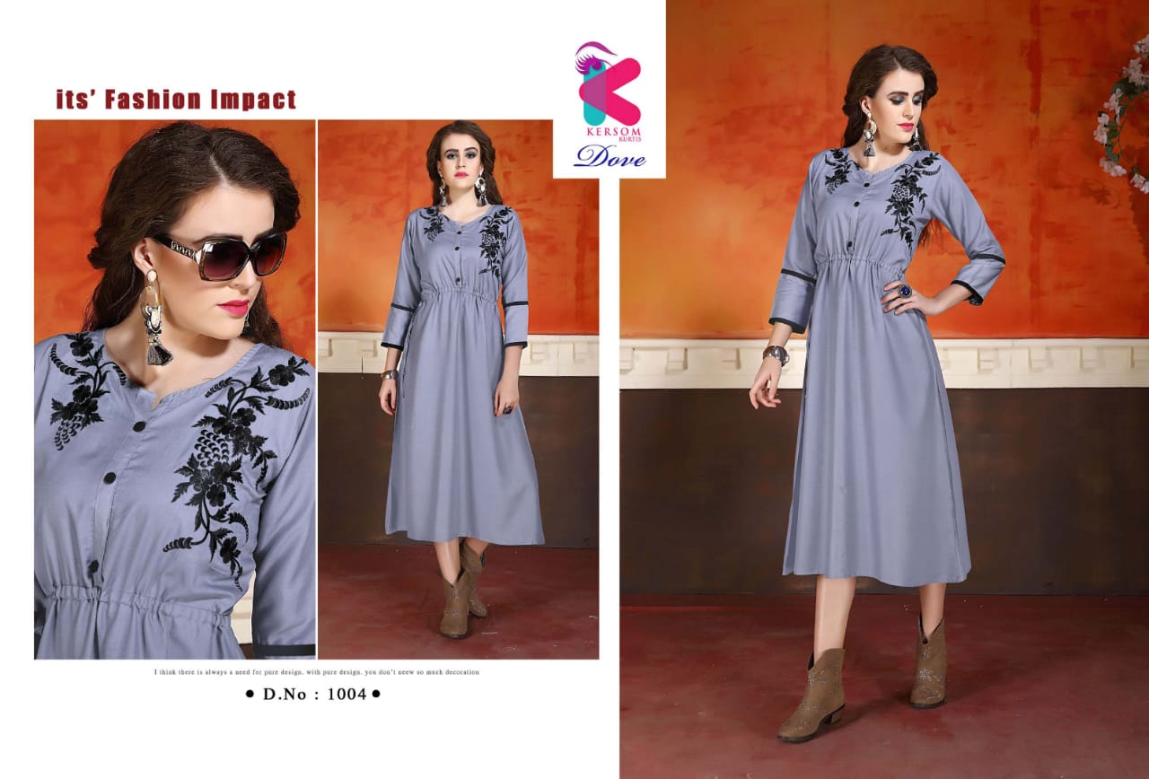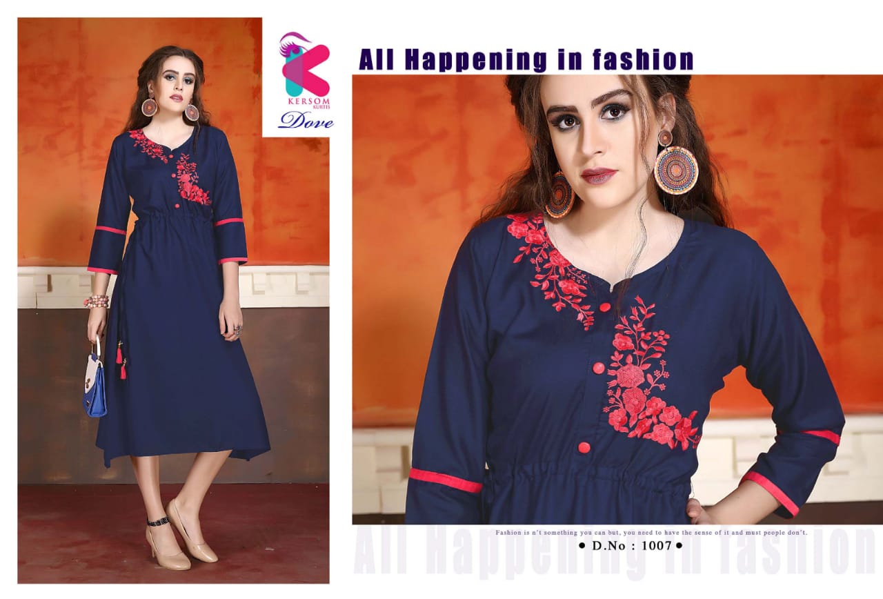 Buy Online Dove By Kersome 1001 Series Heavy Reyon Kurti Collection Wholesaler Surat 8 Pcs of Full Catalogue at Wholesale Price. Looking for Dove By Kersome 1001 Series Heavy Reyon Kurti Collection Wholesaler Surat Full Catalouge at Best Price? Buy Now Dove By Kersome 1001 Series Heavy Reyon Kurti Collection Wholesaler Surat at Wholesale Rate of Rs 3760 with Total 8 Pcs from authroized dealer and supplier of Kersom kurtis Brand. Cost of Each piece is just only Rs 470 which is very low and affordable price to resale the product in your retail store ,This is Surat based Wholesale Supplier & Dealer of Kersom kurtis Brand. Click on Brand name to Know more about Kersom kurtis Brand's products.Call or Whatsapp on 9898838984 for booking or enquiry