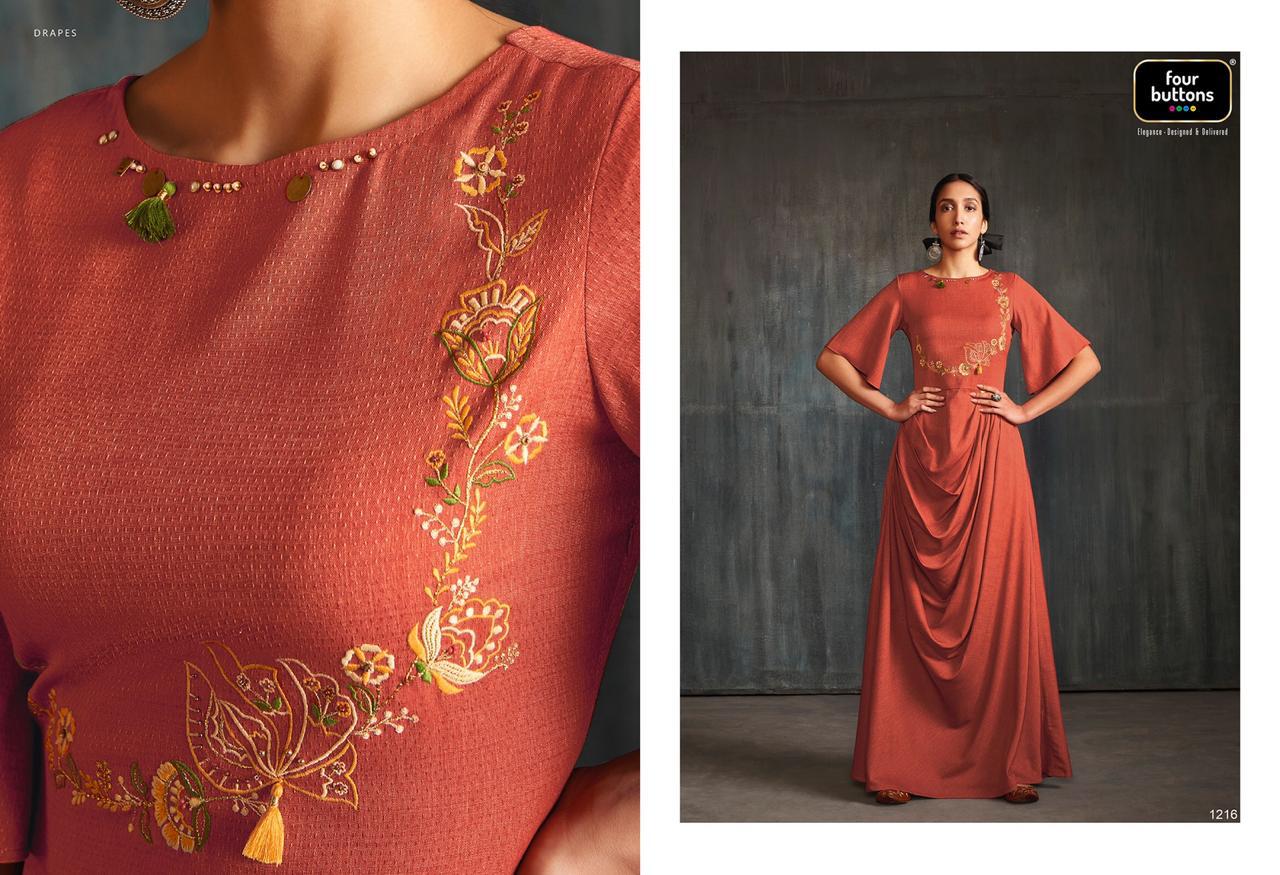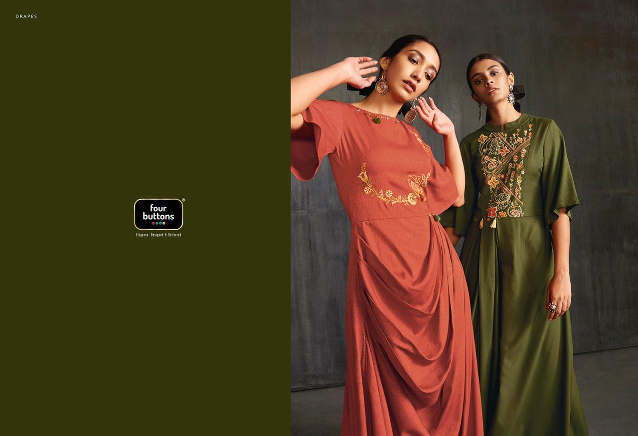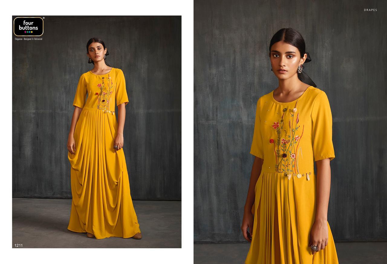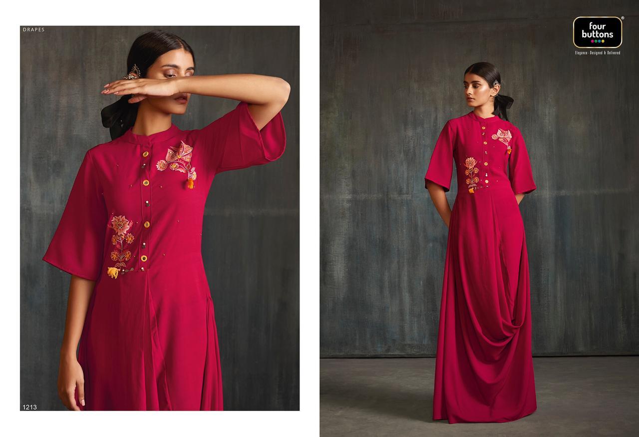 Buy Online Drapes By Four Buttons Fancy Designer Party Wear Kurtis Wholesale Supplier India 6 Pcs of Full Catalogue at Wholesale Price. Looking for Drapes By Four Buttons Fancy Designer Party Wear Kurtis Wholesale Supplier India Full Catalouge at Best Price? Buy Now Drapes By Four Buttons Fancy Designer Party Wear Kurtis Wholesale Supplier India at Wholesale Rate of Rs 7170 with Total 6 Pcs from authroized dealer and supplier of FOUR BUTTONS Brand. Cost of Each piece is just only Rs 1195 which is very low and affordable price to resale the product in your retail store ,This is Surat based Wholesale Supplier & Dealer of FOUR BUTTONS Brand. Click on Brand name to Know more about FOUR BUTTONS Brand's products.Call or Whatsapp on 9898838984 for booking or enquiry