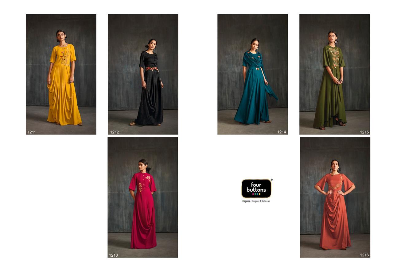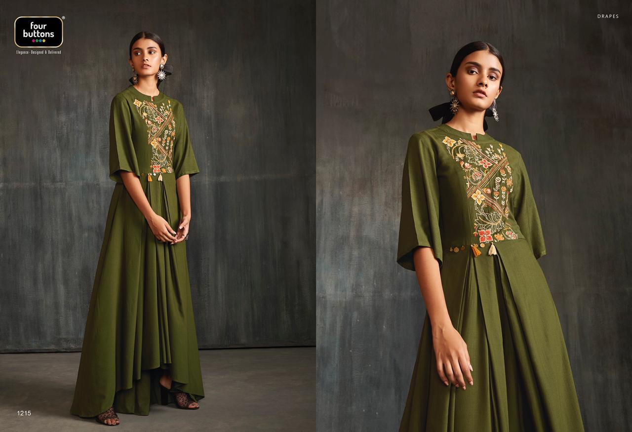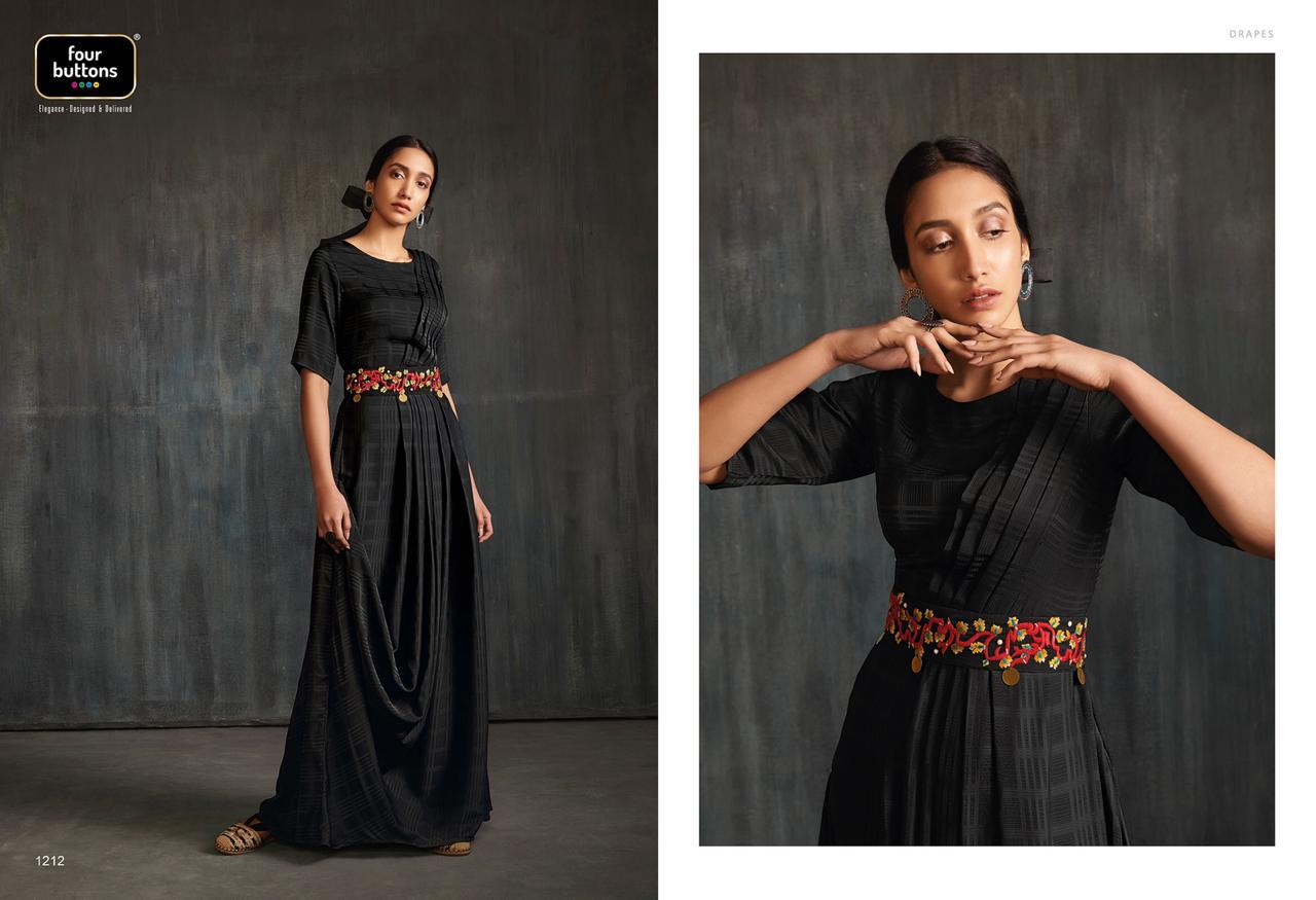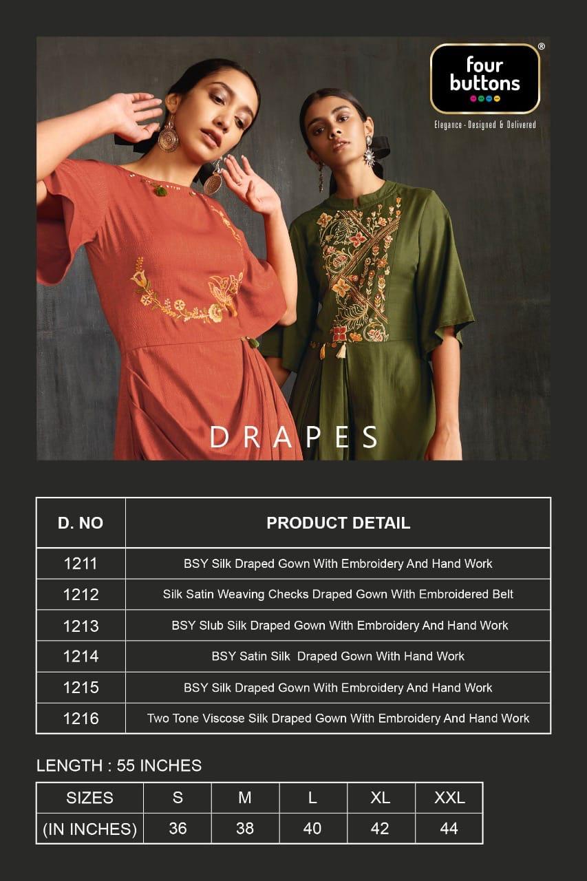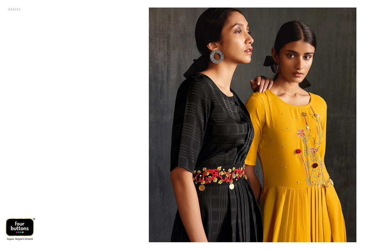 Buy Online Drapes By Four Buttons Fancy Designer Party Wear Kurtis Wholesale Supplier India 6 Pcs of Full Catalogue at Wholesale Price. Looking for Drapes By Four Buttons Fancy Designer Party Wear Kurtis Wholesale Supplier India Full Catalouge at Best Price? Buy Now Drapes By Four Buttons Fancy Designer Party Wear Kurtis Wholesale Supplier India at Wholesale Rate of Rs 7170 with Total 6 Pcs from authroized dealer and supplier of FOUR BUTTONS Brand. Cost of Each piece is just only Rs 1195 which is very low and affordable price to resale the product in your retail store ,This is Surat based Wholesale Supplier & Dealer of FOUR BUTTONS Brand. Click on Brand name to Know more about FOUR BUTTONS Brand's products.Call or Whatsapp on 9898838984 for booking or enquiry
