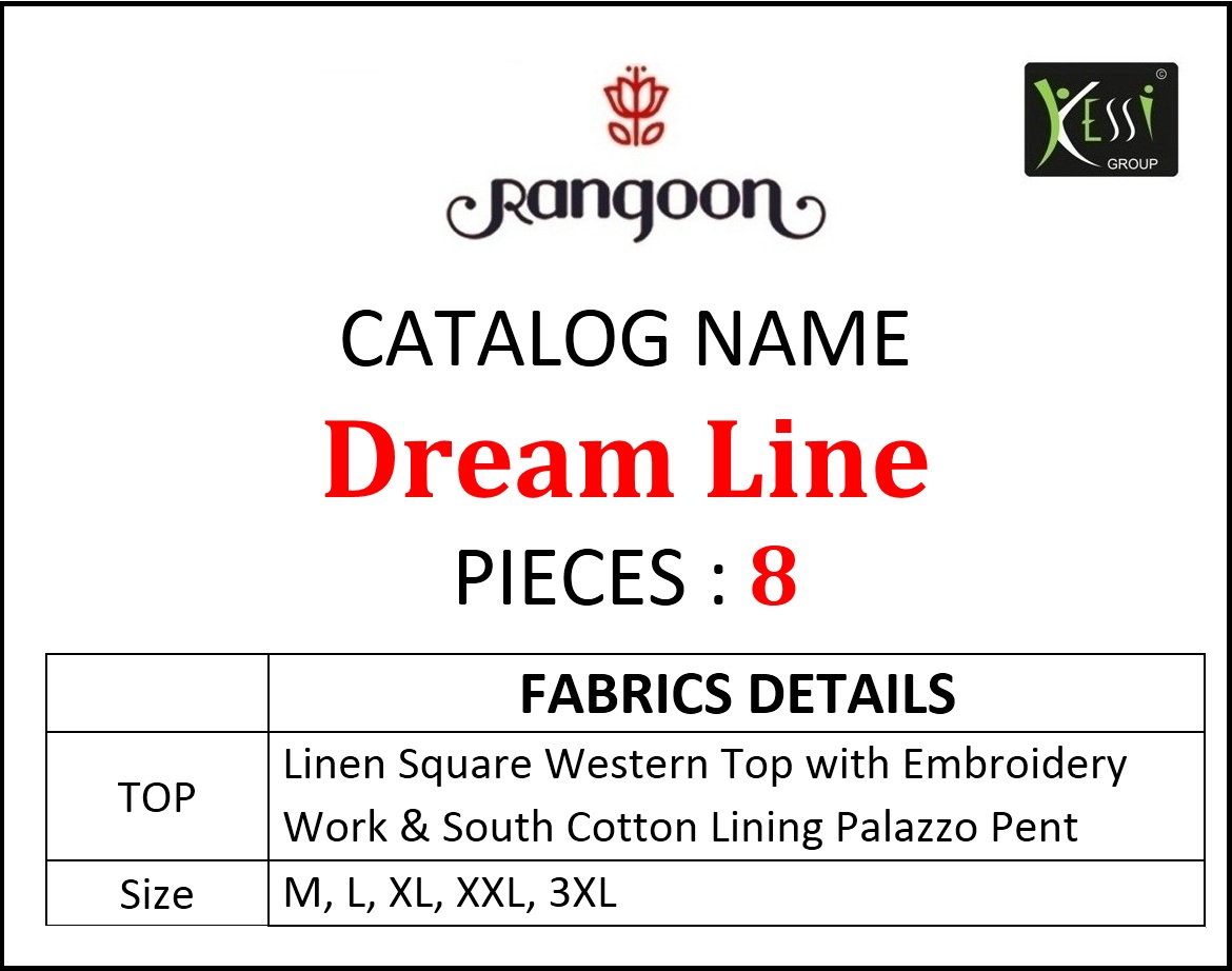 ? *Rangoon (Kessi Fabrics Pvt. Ltd.)* has launched _Catalog name_ : *Dream Line* ? _Fabric Details_ ? ?Top:- Line Square Western Top with Embroidery Work & South Cotton Lining Palazoo Pent ?Total Design:- 8 ?Size;- M, L, XL, XXL, 3XL Rate. 799/- Set to set . GST 5 Percent Extra ?Booking started from now... ?Order yours soon... |