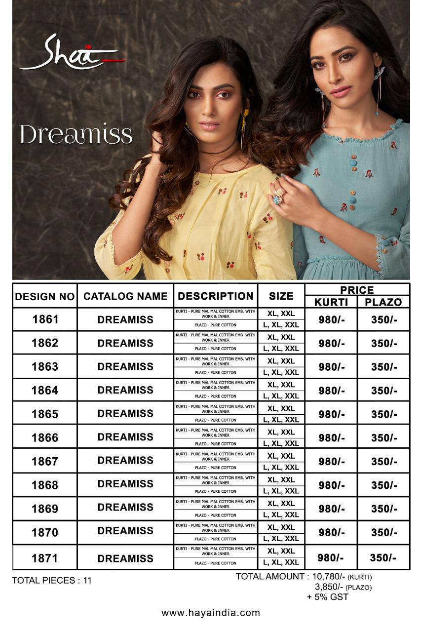 Buy Online Dreamiss By Shai Kurtis Plazzo Set Wholesale Supplier And Dealer Surat 11 Pcs of Full Catalogue at Wholesale Price. Looking for Dreamiss By Shai Kurtis Plazzo Set Wholesale Supplier And Dealer Surat Full Catalouge at Best Price? Buy Now Dreamiss By Shai Kurtis Plazzo Set Wholesale Supplier And Dealer Surat at Wholesale Rate of Rs 0 with Total 11 Pcs from authroized dealer and supplier of SHAI Brand. Cost of Each piece is just only Rs 0 which is very low and affordable price to resale the product in your retail store ,This is Surat based Wholesale Supplier & Dealer of SHAI Brand. Click on Brand name to Know more about SHAI Brand's products.Call or Whatsapp on 9898838984 for booking or enquiry