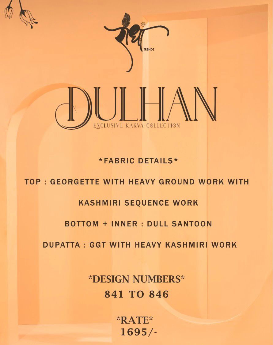 Buy Online Dulhan By Radha Trendz Manufacturer Traders Surat Gujarat 6 Pcs of Full Catalogue at Wholesale Price. Looking for Dulhan By Radha Trendz Manufacturer Traders Surat Gujarat Full Catalouge at Best Price? Buy Now Dulhan By Radha Trendz Manufacturer Traders Surat Gujarat at Wholesale Rate of Rs 10170 with Total 6 Pcs from authroized dealer and supplier of Brand. Cost of Each piece is just only Rs 1695 which is very low and affordable price to resale the product in your retail store ,This is Surat based Wholesale Supplier & Dealer of Brand. Click on Brand name to Know more about Brand's products.Call or Whatsapp on 9898838984 for booking or enquiry