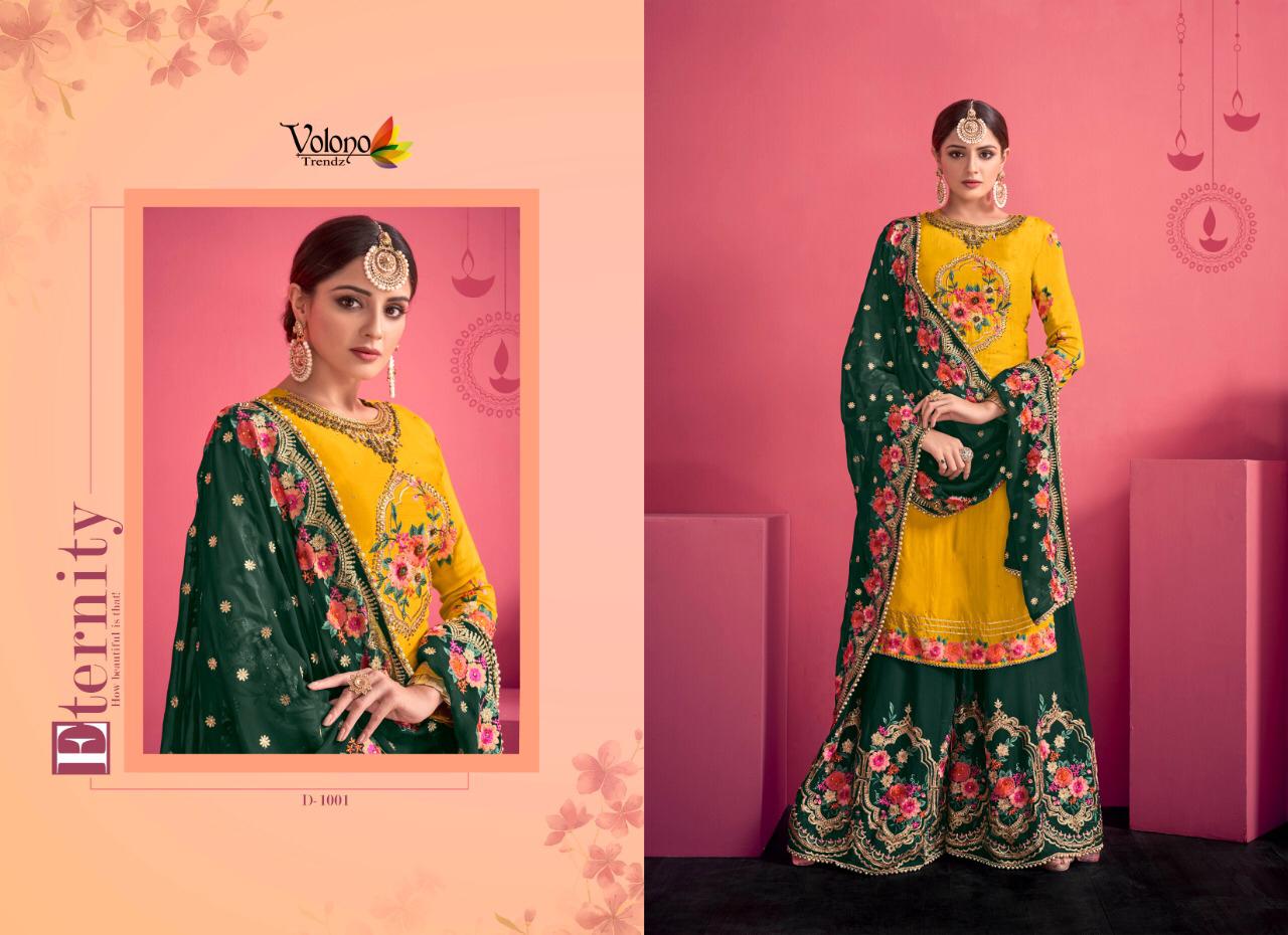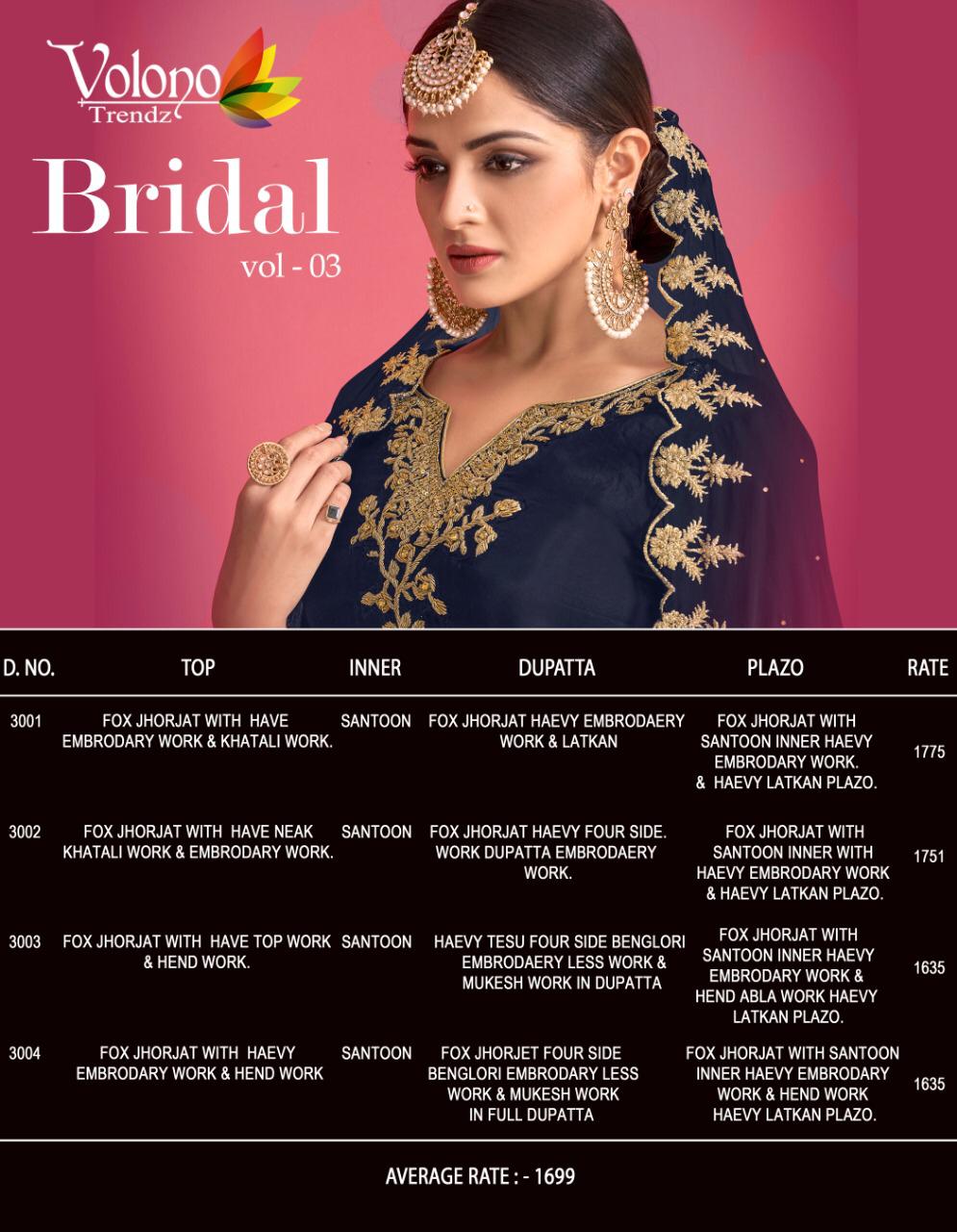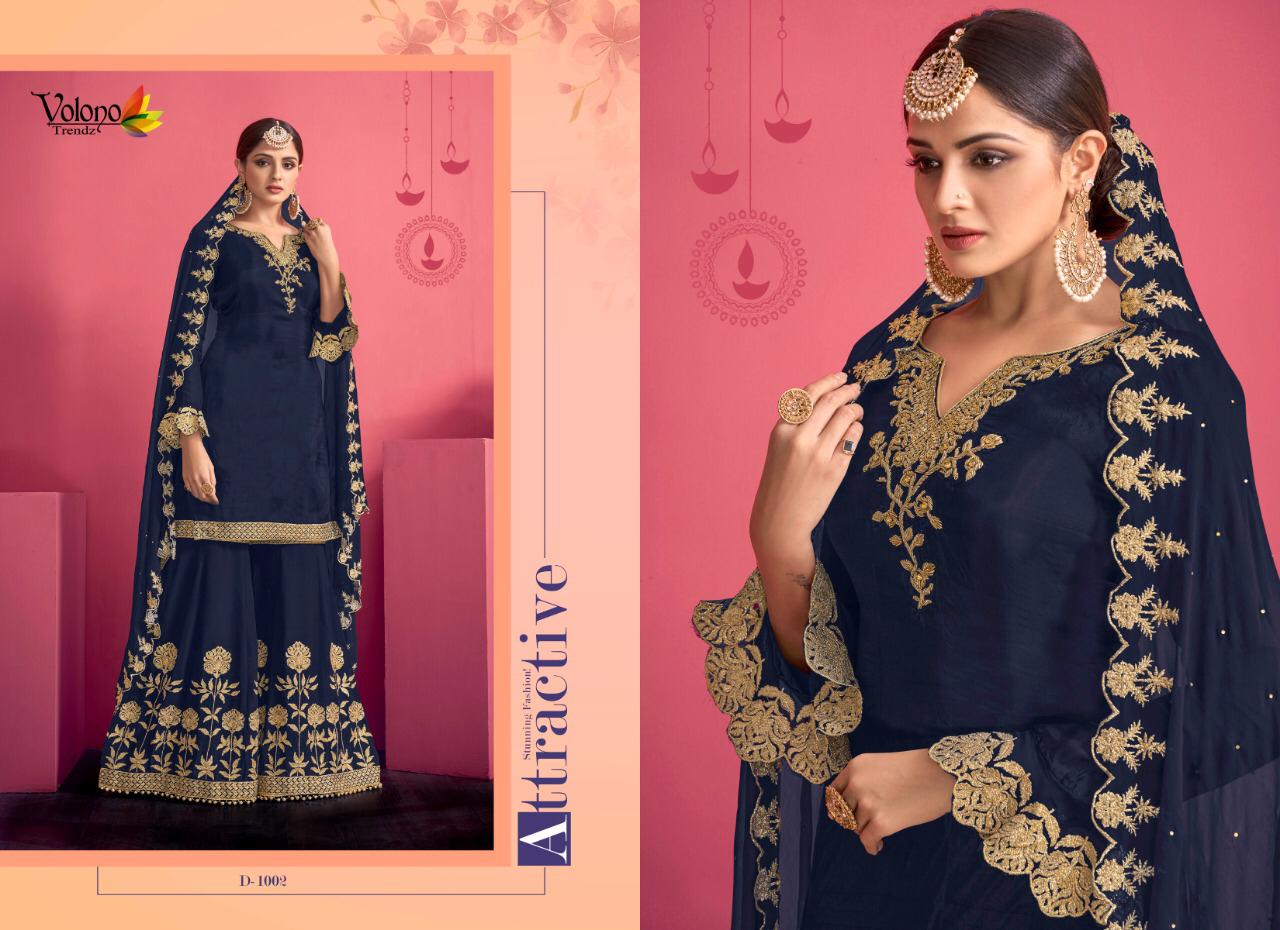 Buy Online Dulhan Vol 1 By Volono Trendz 1001 Series Fancy Party Wear Pakistani Sarara Suit Catlog Wholesale Dealer Surat 4 Pcs of Full Catalogue at Wholesale Price. Looking for Dulhan Vol 1 By Volono Trendz 1001 Series Fancy Party Wear Pakistani Sarara Suit Catlog Wholesale Dealer Surat Full Catalouge at Best Price? Buy Now Dulhan Vol 1 By Volono Trendz 1001 Series Fancy Party Wear Pakistani Sarara Suit Catlog Wholesale Dealer Surat at Wholesale Rate of Rs 6796 with Total 4 Pcs from authroized dealer and supplier of VOLONO TRENDZ Brand. Cost of Each piece is just only Rs 1699 which is very low and affordable price to resale the product in your retail store ,This is Surat based Wholesale Supplier & Dealer of VOLONO TRENDZ Brand. Click on Brand name to Know more about VOLONO TRENDZ Brand's products.Call or Whatsapp on 9898838984 for booking or enquiry