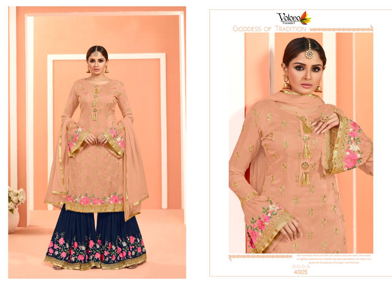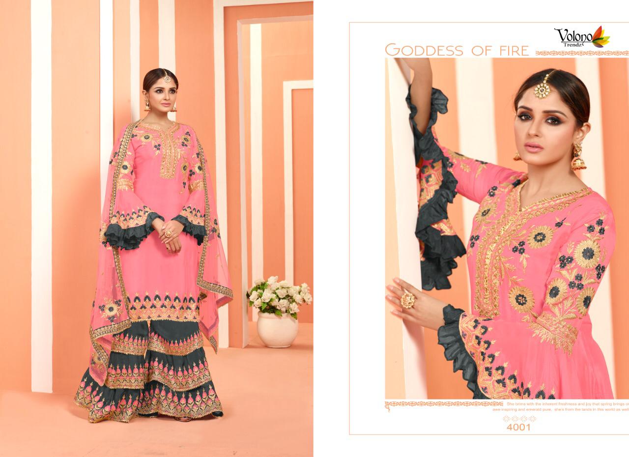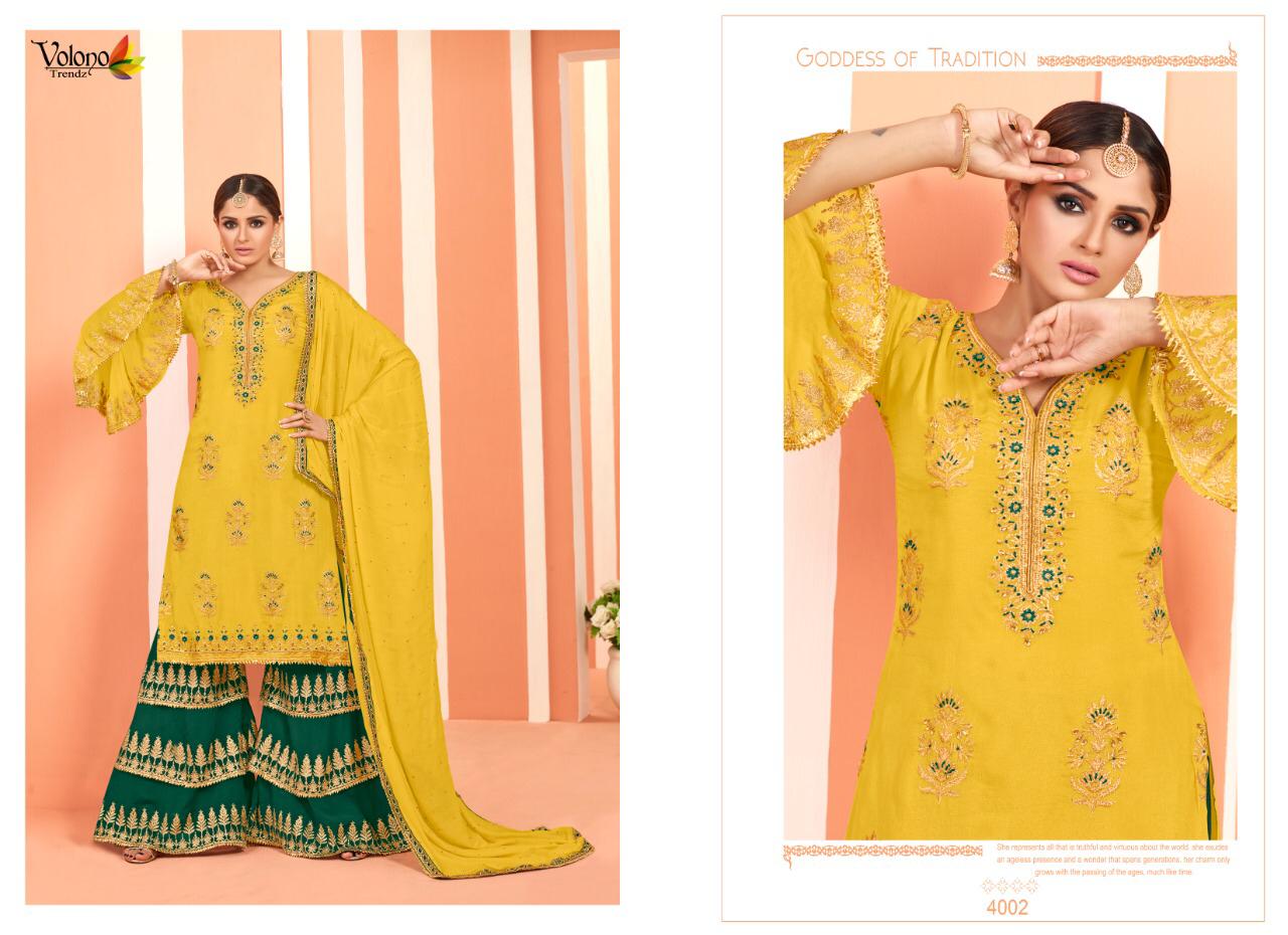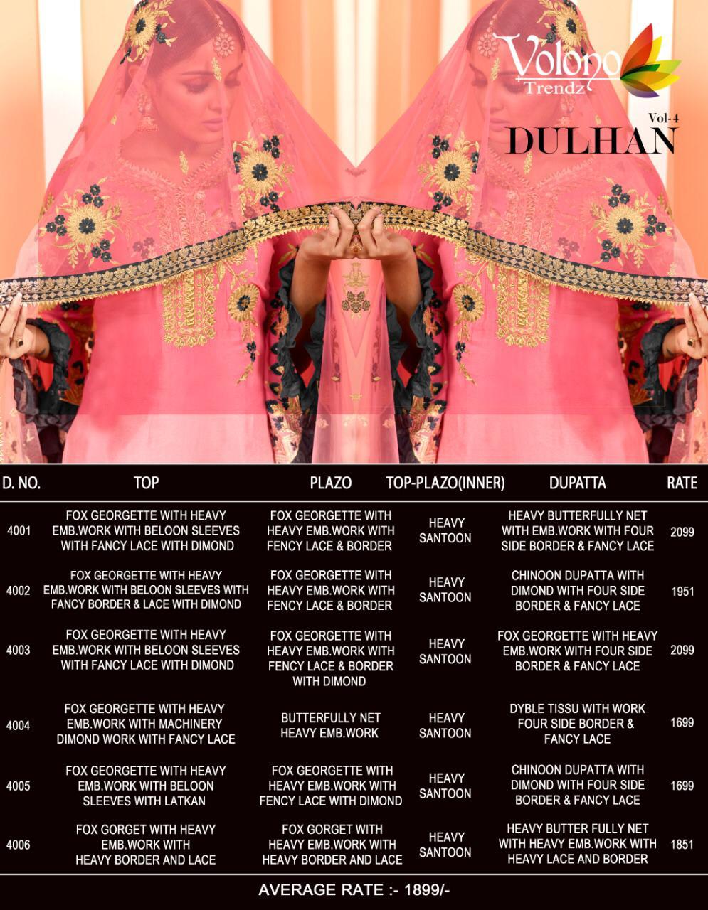 Buy Online Dulhan Vol 4 By Volono Trendz Series 4001 To 4006 Designer Party Wear Suits Wholesale Supplier Gujarat 6 Pcs of Full Catalogue at Wholesale Price. Looking for Dulhan Vol 4 By Volono Trendz Series 4001 To 4006 Designer Party Wear Suits Wholesale Supplier Gujarat Full Catalouge at Best Price? Buy Now Dulhan Vol 4 By Volono Trendz Series 4001 To 4006 Designer Party Wear Suits Wholesale Supplier Gujarat at Wholesale Rate of Rs 11394 with Total 6 Pcs from authroized dealer and supplier of VOLONO TRENDZ Brand. Cost of Each piece is just only Rs 1899 which is very low and affordable price to resale the product in your retail store ,This is Surat based Wholesale Supplier & Dealer of VOLONO TRENDZ Brand. Click on Brand name to Know more about VOLONO TRENDZ Brand's products.Call or Whatsapp on 9898838984 for booking or enquiry