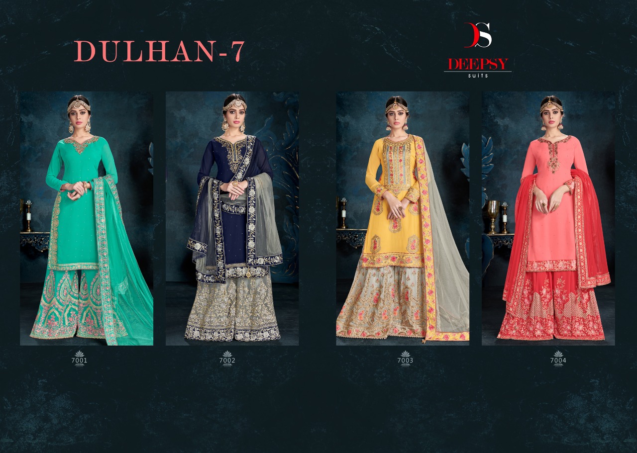 Buy Online Dulhan Vol 7 Bridal Collection By Deepsy 7001 Series Designer Georgette Sarara Suit Catlog Wholesale Dealer Surat 4 Pcs of Full Catalogue at Wholesale Price. Looking for Dulhan Vol 7 Bridal Collection By Deepsy 7001 Series Designer Georgette Sarara Suit Catlog Wholesale Dealer Surat Full Catalouge at Best Price? Buy Now Dulhan Vol 7 Bridal Collection By Deepsy 7001 Series Designer Georgette Sarara Suit Catlog Wholesale Dealer Surat at Wholesale Rate of Rs 7596 with Total 4 Pcs from authroized dealer and supplier of DEEPSY Brand. Cost of Each piece is just only Rs 1899 which is very low and affordable price to resale the product in your retail store ,This is Surat based Wholesale Supplier & Dealer of DEEPSY Brand. Click on Brand name to Know more about DEEPSY Brand's products.Call or Whatsapp on 9898838984 for booking or enquiry
