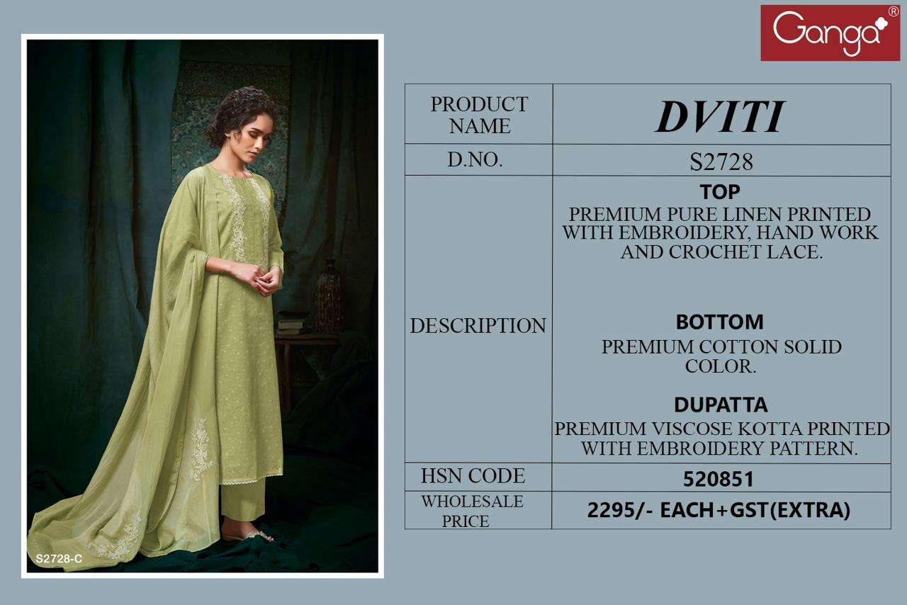 Buy Online DVITI 2728 by ganga LINEN printed suit collection manufacturer surat 4 Pcs of Full Catalogue at Wholesale Price. Looking for DVITI 2728 by ganga LINEN printed suit collection manufacturer surat Full Catalouge at Best Price? Buy Now DVITI 2728 by ganga LINEN printed suit collection manufacturer surat at Wholesale Rate of Rs 9180 with Total 4 Pcs from authroized dealer and supplier of GANGA Brand. Cost of Each piece is just only Rs 2295 which is very low and affordable price to resale the product in your retail store ,This is Surat based Wholesale Supplier & Dealer of GANGA Brand. Click on Brand name to Know more about GANGA Brand's products.Call or Whatsapp on 9898838984 for booking or enquiry