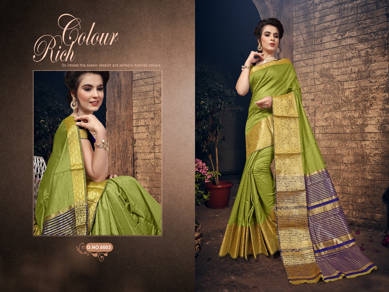 Brand - Dwarkanath. Type - Saree. Latest catlog: ALONA Cottan silk With contras blouse and pallu @ 495/- SET & LOOSE . Delivery from-20/08/18 For singleÂ?s price call or whatsapp on +919898838984 |