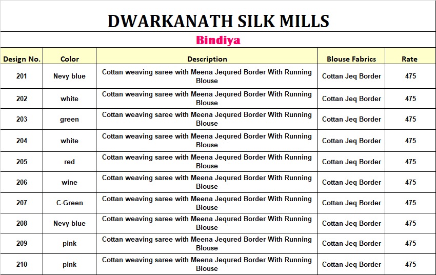 Buy Online Dwarkanath Silk Mills Bindiya 201 Series Cotton Silk Saree Catlog Wholesale Supplier And Trader Surat 12 Pcs of Full Catalogue at Wholesale Price. Looking for Dwarkanath Silk Mills Bindiya 201 Series Cotton Silk Saree Catlog Wholesale Supplier And Trader Surat Full Catalouge at Best Price? Buy Now Dwarkanath Silk Mills Bindiya 201 Series Cotton Silk Saree Catlog Wholesale Supplier And Trader Surat at Wholesale Rate of Rs 5700 with Total 12 Pcs from authroized dealer and supplier of Dwarkanath silk mills Brand. Cost of Each piece is just only Rs 475 which is very low and affordable price to resale the product in your retail store ,This is Surat based Wholesale Supplier & Dealer of Dwarkanath silk mills Brand. Click on Brand name to Know more about Dwarkanath silk mills Brand's products.Call or Whatsapp on 9898838984 for booking or enquiry