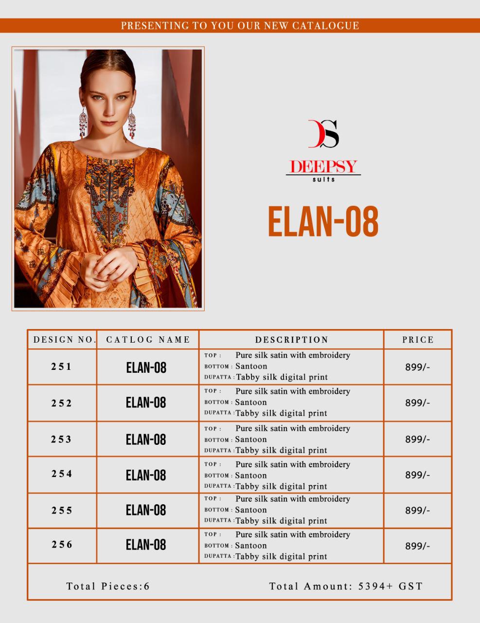 Buy Online Elan 8 By Deepsy Pakistani Suits Wholesale Supplier Gujarat 6 Pcs of Full Catalogue at Wholesale Price. Looking for Elan 8 By Deepsy Pakistani Suits Wholesale Supplier Gujarat Full Catalouge at Best Price? Buy Now Elan 8 By Deepsy Pakistani Suits Wholesale Supplier Gujarat at Wholesale Rate of Rs 5394 with Total 6 Pcs from authroized dealer and supplier of DEEPSY Brand. Cost of Each piece is just only Rs 899 which is very low and affordable price to resale the product in your retail store ,This is Surat based Wholesale Supplier & Dealer of DEEPSY Brand. Click on Brand name to Know more about DEEPSY Brand's products.Call or Whatsapp on 9898838984 for booking or enquiry