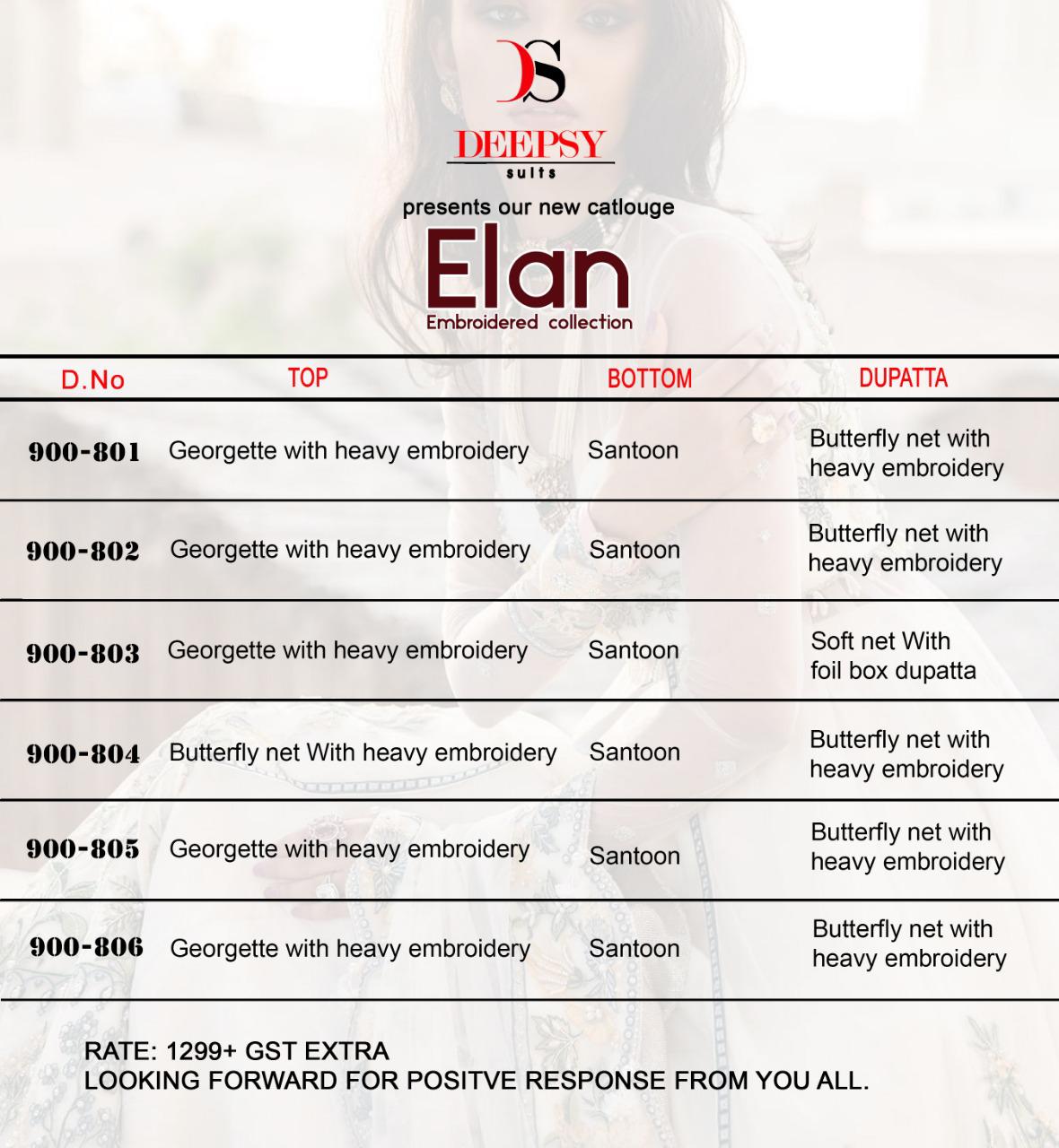 Buy Online Elan Embroidered Collection By Deepsy Series 900801 To 900806 Pakistani Suits Wholesale Supplier Surat 6 Pcs of Full Catalogue at Wholesale Price. Looking for Elan Embroidered Collection By Deepsy Series 900801 To 900806 Pakistani Suits Wholesale Supplier Surat Full Catalouge at Best Price? Buy Now Elan Embroidered Collection By Deepsy Series 900801 To 900806 Pakistani Suits Wholesale Supplier Surat at Wholesale Rate of Rs 7794 with Total 6 Pcs from authroized dealer and supplier of DEEPSY Brand. Cost of Each piece is just only Rs 1299 which is very low and affordable price to resale the product in your retail store ,This is Surat based Wholesale Supplier & Dealer of DEEPSY Brand. Click on Brand name to Know more about DEEPSY Brand's products.Call or Whatsapp on 9898838984 for booking or enquiry