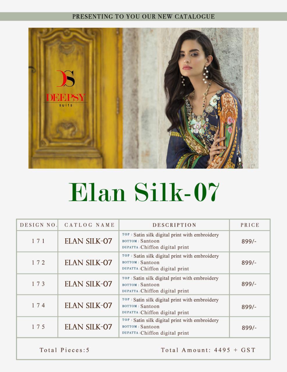 Buy Online Elan Silk 07 By Deepsy Satin Digital Printed Embroidered Pakistani Suit Wholesale Supplier Nd Dealer India 5 Pcs of Full Catalogue at Wholesale Price. Looking for Elan Silk 07 By Deepsy Satin Digital Printed Embroidered Pakistani Suit Wholesale Supplier Nd Dealer India Full Catalouge at Best Price? Buy Now Elan Silk 07 By Deepsy Satin Digital Printed Embroidered Pakistani Suit Wholesale Supplier Nd Dealer India at Wholesale Rate of Rs 4495 with Total 5 Pcs from authroized dealer and supplier of DEEPSY Brand. Cost of Each piece is just only Rs 899 which is very low and affordable price to resale the product in your retail store ,This is Surat based Wholesale Supplier & Dealer of DEEPSY Brand. Click on Brand name to Know more about DEEPSY Brand's products.Call or Whatsapp on 9898838984 for booking or enquiry