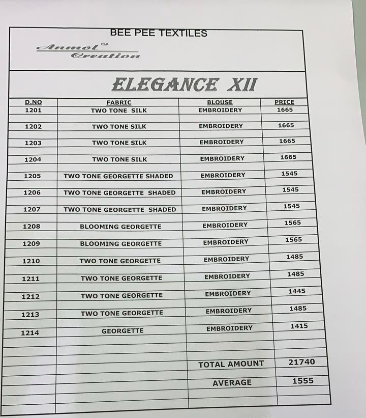 Buy Online Elegance Vol 12 Series 1201 To 1214 By Anmol Single And Set Stockiest And Supplier From Surat 14 Pcs of Full Catalogue at Wholesale Price. Looking for Elegance Vol 12 Series 1201 To 1214 By Anmol Single And Set Stockiest And Supplier From Surat Full Catalouge at Best Price? Buy Now Elegance Vol 12 Series 1201 To 1214 By Anmol Single And Set Stockiest And Supplier From Surat at Wholesale Rate of Rs 0 with Total 14 Pcs from authroized dealer and supplier of Brand. Cost of Each piece is just only Rs 0 which is very low and affordable price to resale the product in your retail store ,This is Surat based Wholesale Supplier & Dealer of Brand. Click on Brand name to Know more about Brand's products.Call or Whatsapp on 9898838984 for booking or enquiry