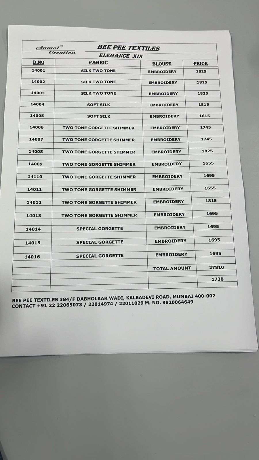 BRAND ANMOL CREATION CATLOGUE ELEGANCE VOL 19 SERIES 14001 TO 14016 RATE LIST ATTACHED GST 5% EXTRA |