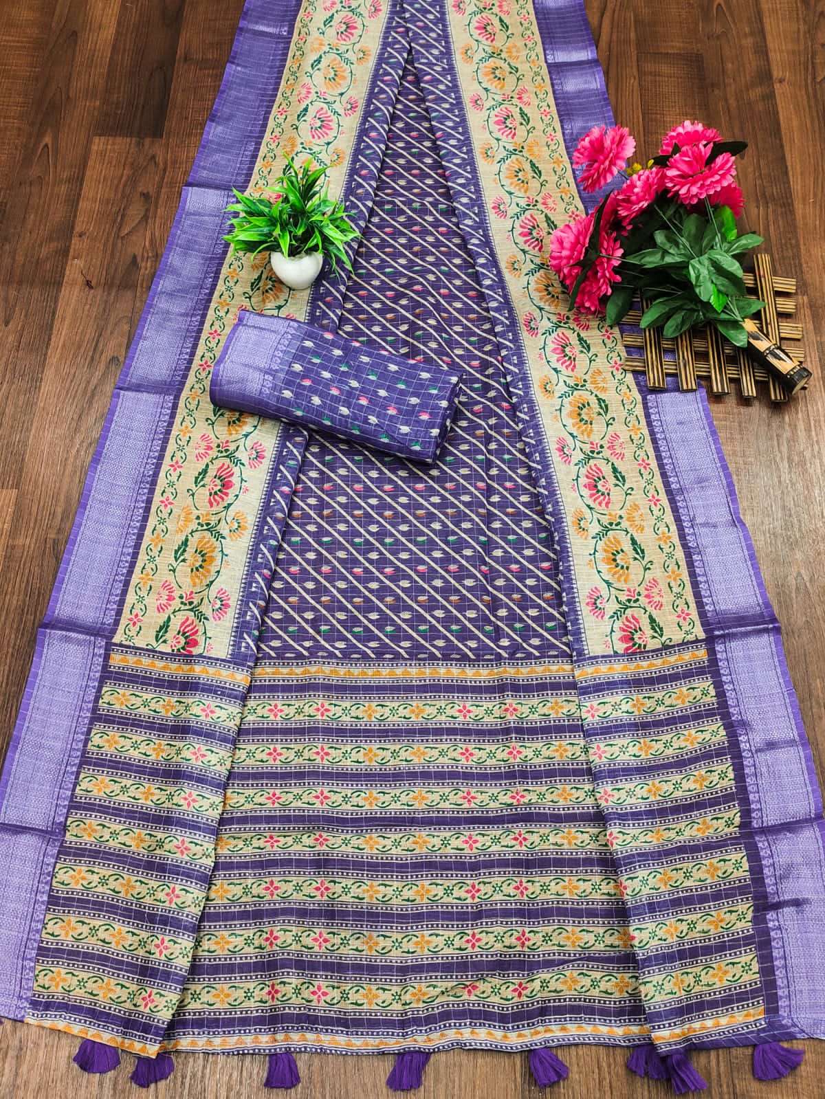 Elegant Soft Cotton Checks Linen Saree with Block Print