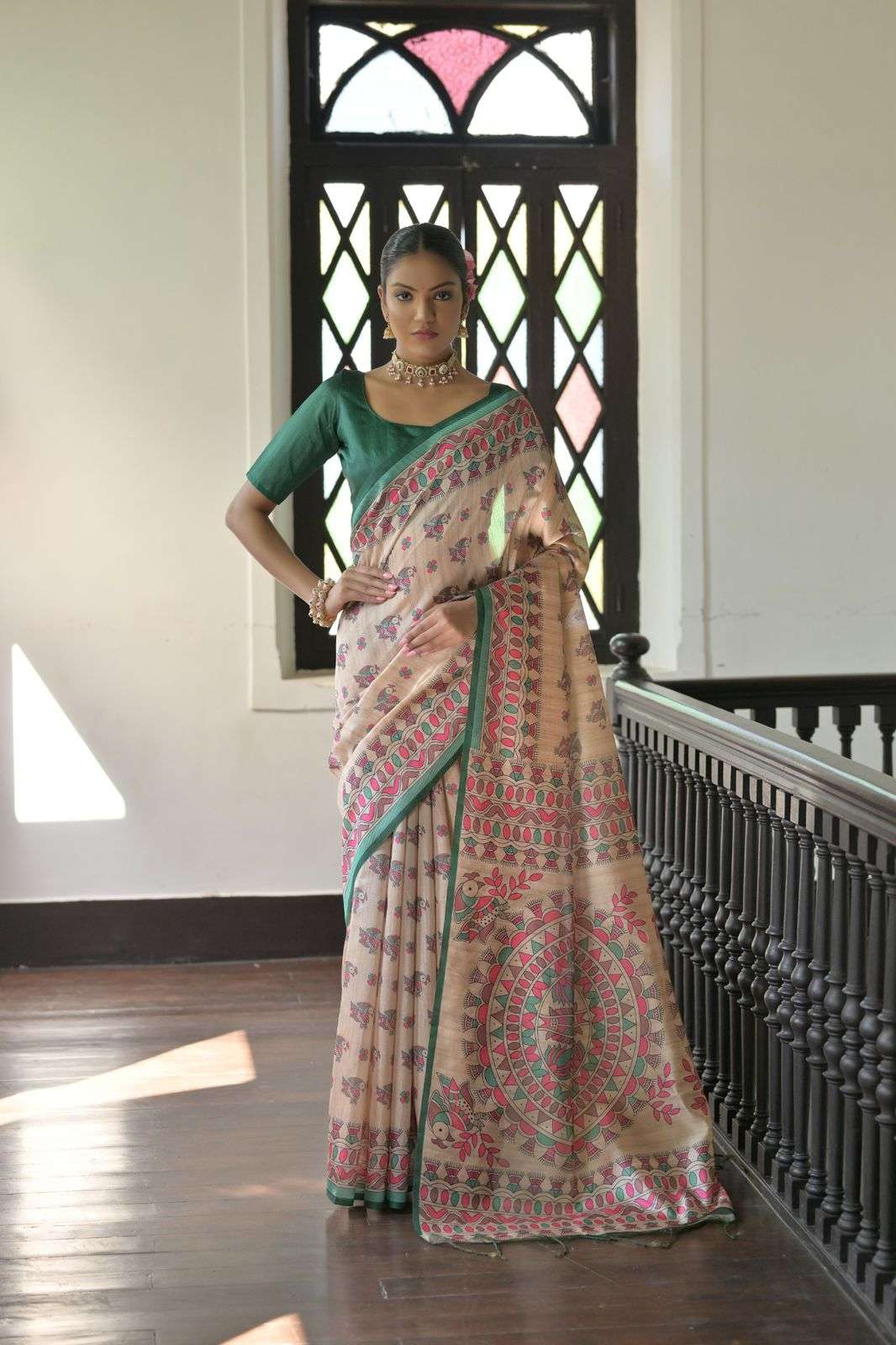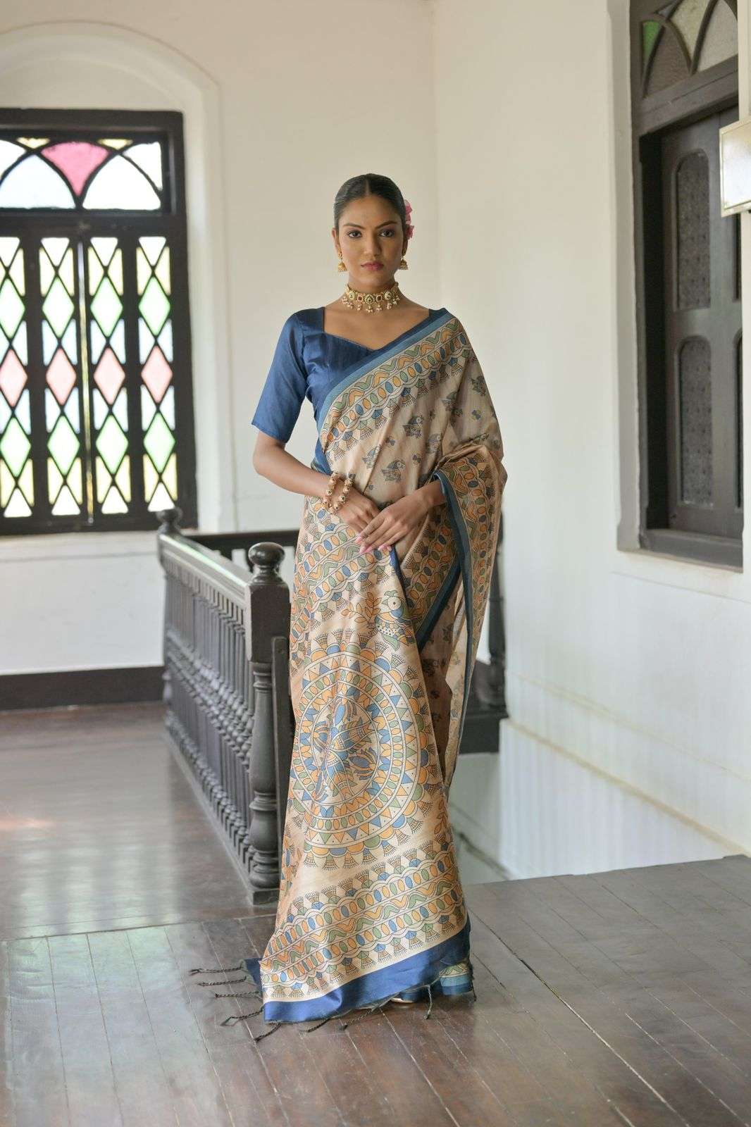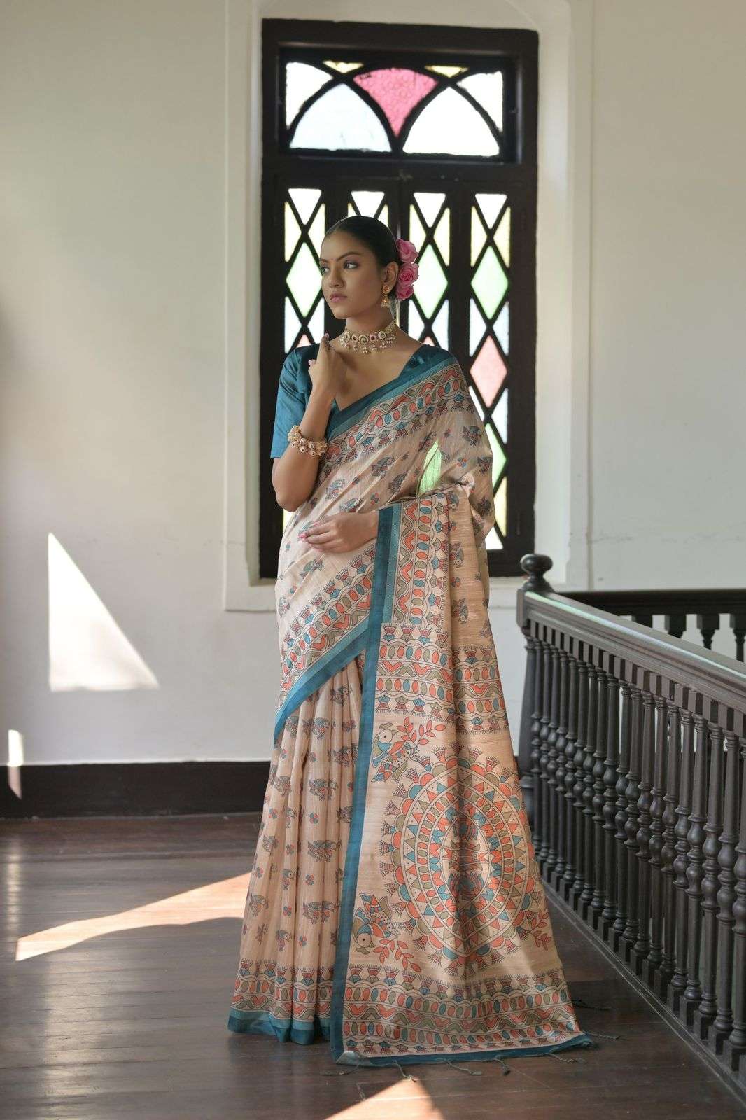 elegant Soft Tussar Silk Saree featuring exquisite Madhubani prints.