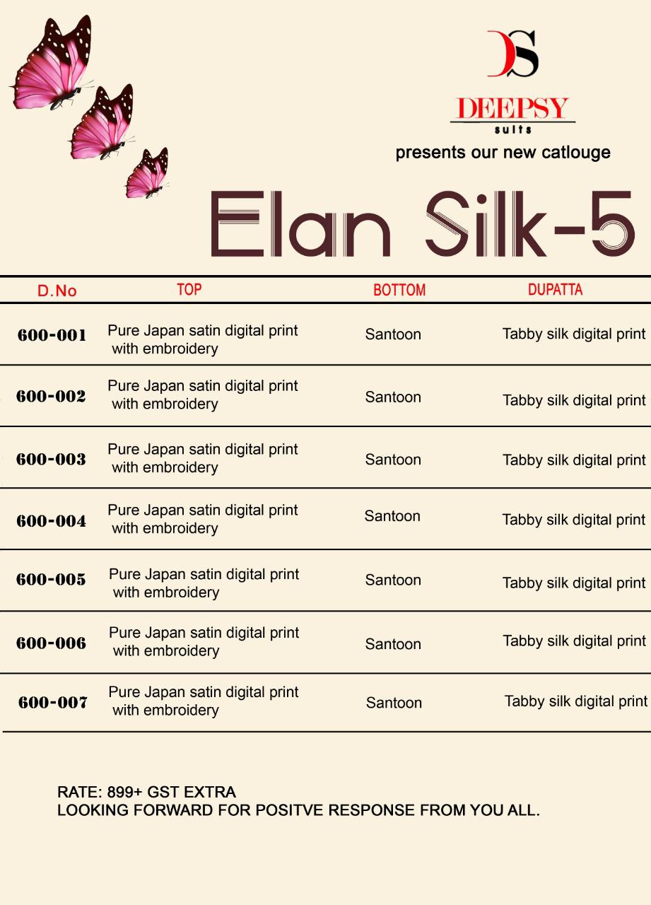 Buy Online Elen Silk Vol 5 By Deepsy 600001 Series Fancy Japan Satin Digital Printed Salwar Kameez Catlog Wholesaler Surat 7 Pcs of Full Catalogue at Wholesale Price. Looking for Elen Silk Vol 5 By Deepsy 600001 Series Fancy Japan Satin Digital Printed Salwar Kameez Catlog Wholesaler Surat Full Catalouge at Best Price? Buy Now Elen Silk Vol 5 By Deepsy 600001 Series Fancy Japan Satin Digital Printed Salwar Kameez Catlog Wholesaler Surat at Wholesale Rate of Rs 6293 with Total 7 Pcs from authroized dealer and supplier of DEEPSY Brand. Cost of Each piece is just only Rs 899 which is very low and affordable price to resale the product in your retail store ,This is Surat based Wholesale Supplier & Dealer of DEEPSY Brand. Click on Brand name to Know more about DEEPSY Brand's products.Call or Whatsapp on 9898838984 for booking or enquiry