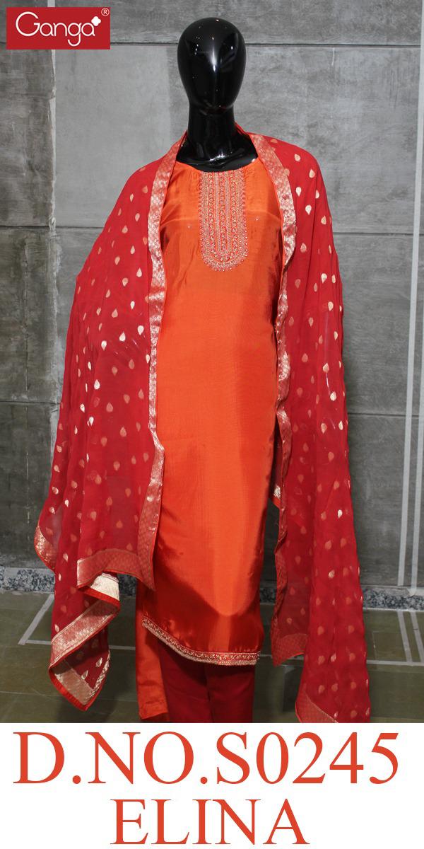 *GANGA* ELINA 245 *TOP-* FOUR BEMBERG UPADA SILK WITH EMBROIDERY AND HAND WORK *BOTTOM-* SILKY SATIN *DUPATTA-* PURE GEORGET BANARSI JACQUARD VERY LESS STOCK BOOK FAST. |
