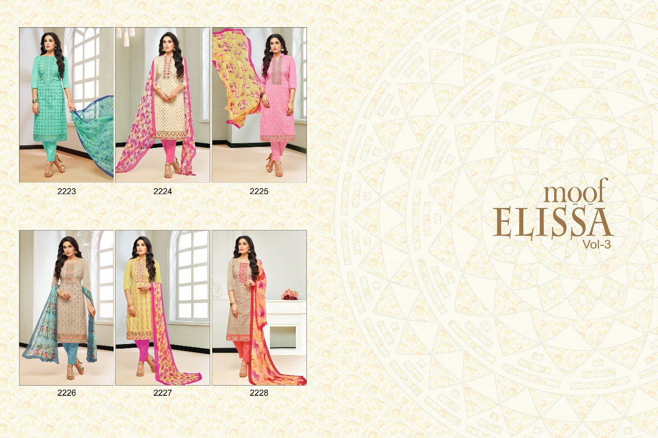 Buy Online Elissa Vol 3 By Moof Fashion Model Stylish Work Desinger Suits Wholesale Supplier And Manufacturer Surat 6 Pcs of Full Catalogue at Wholesale Price. Looking for Elissa Vol 3 By Moof Fashion Model Stylish Work Desinger Suits Wholesale Supplier And Manufacturer Surat Full Catalouge at Best Price? Buy Now Elissa Vol 3 By Moof Fashion Model Stylish Work Desinger Suits Wholesale Supplier And Manufacturer Surat at Wholesale Rate of Rs 4194 with Total 6 Pcs from authroized dealer and supplier of MOOF FASHION Brand. Cost of Each piece is just only Rs 699 which is very low and affordable price to resale the product in your retail store ,This is Surat based Wholesale Supplier & Dealer of MOOF FASHION Brand. Click on Brand name to Know more about MOOF FASHION Brand's products.Call or Whatsapp on 9898838984 for booking or enquiry