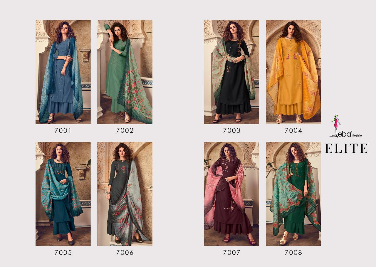 Buy Online Elite Vol 1 By Eba Lifestyle Series 7001 To 7008 Designer Party Wear Suits Wholesale Supplier Gujarat 8 Pcs of Full Catalogue at Wholesale Price. Looking for Elite Vol 1 By Eba Lifestyle Series 7001 To 7008 Designer Party Wear Suits Wholesale Supplier Gujarat Full Catalouge at Best Price? Buy Now Elite Vol 1 By Eba Lifestyle Series 7001 To 7008 Designer Party Wear Suits Wholesale Supplier Gujarat at Wholesale Rate of Rs 7160 with Total 8 Pcs from authroized dealer and supplier of Eba Lifestyle Brand. Cost of Each piece is just only Rs 895 which is very low and affordable price to resale the product in your retail store ,This is Surat based Wholesale Supplier & Dealer of Eba Lifestyle Brand. Click on Brand name to Know more about Eba Lifestyle Brand's products.Call or Whatsapp on 9898838984 for booking or enquiry