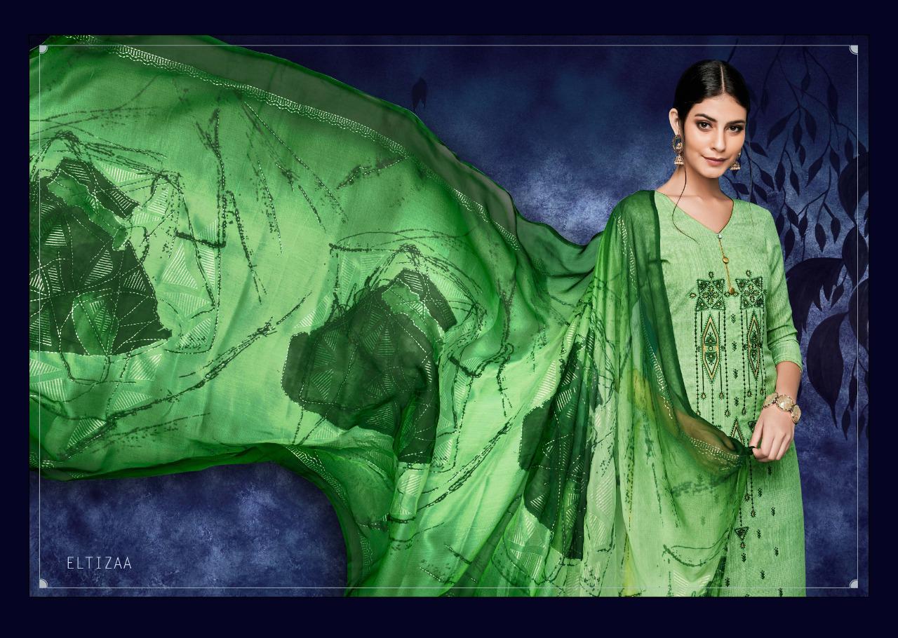 SARGAM PRINTS Present ***ELTIZAA*** *?Fabric Details?* *Top:* PURE PASHMINA NAGETIVE (2.40)WITH DESIGNER WORK *Bottom:* PASHMINA DYED *Dupatta:* PURE BEMBERG( FOIL) PRINTED *Designs:* 8PCS *Ex Mill:* 925? *HSN CODE:*5407 |