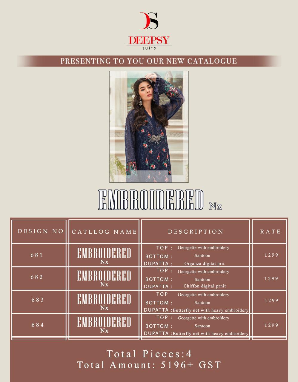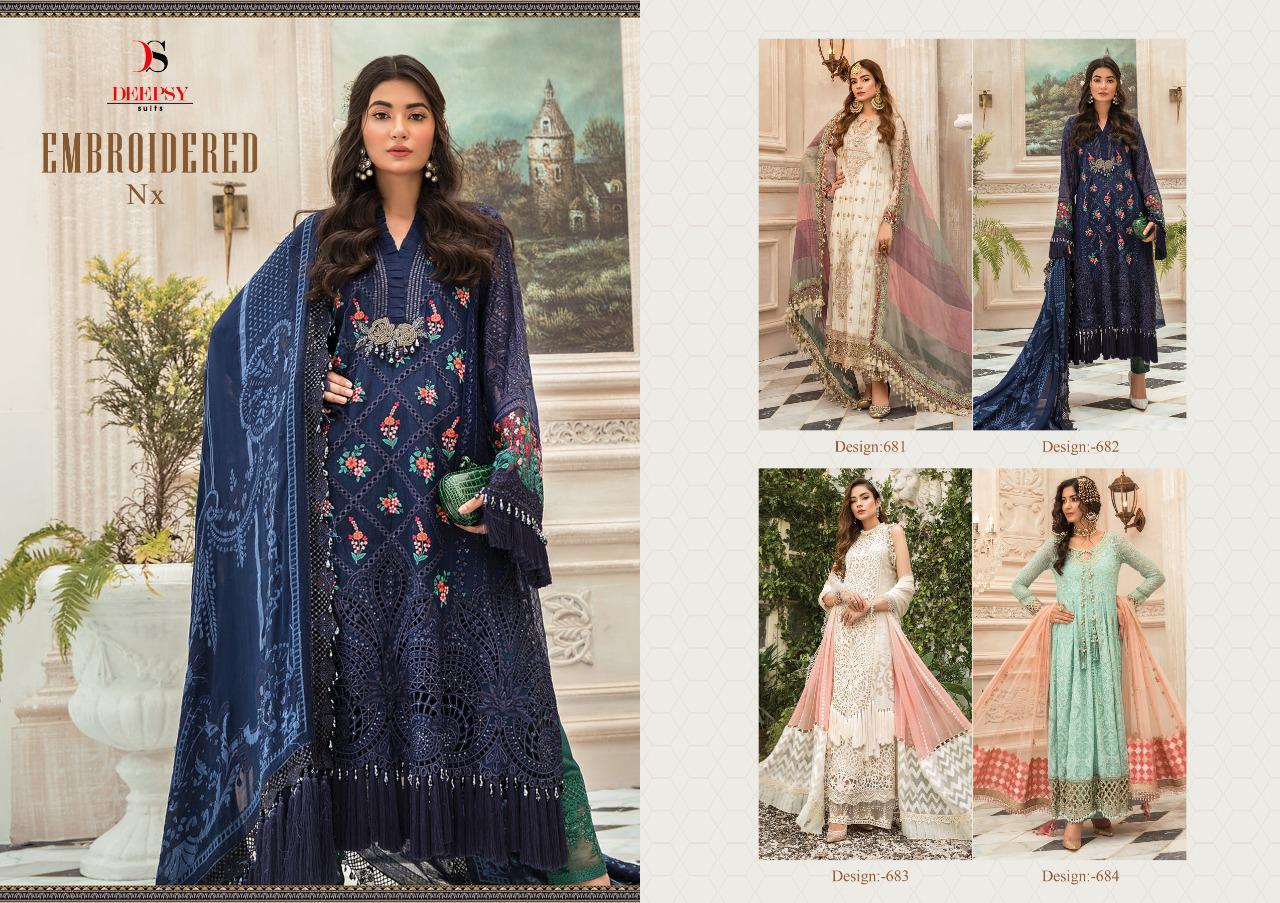 Buy Online Embroidered Nx By Deepsy Series 681 To 684 Pakistani Suits Wholesale Supplier And Dealer Gujarat 4 Pcs of Full Catalogue at Wholesale Price. Looking for Embroidered Nx By Deepsy Series 681 To 684 Pakistani Suits Wholesale Supplier And Dealer Gujarat Full Catalouge at Best Price? Buy Now Embroidered Nx By Deepsy Series 681 To 684 Pakistani Suits Wholesale Supplier And Dealer Gujarat at Wholesale Rate of Rs 5196 with Total 4 Pcs from authroized dealer and supplier of DEEPSY Brand. Cost of Each piece is just only Rs 1299 which is very low and affordable price to resale the product in your retail store ,This is Surat based Wholesale Supplier & Dealer of DEEPSY Brand. Click on Brand name to Know more about DEEPSY Brand's products.Call or Whatsapp on 9898838984 for booking or enquiry
