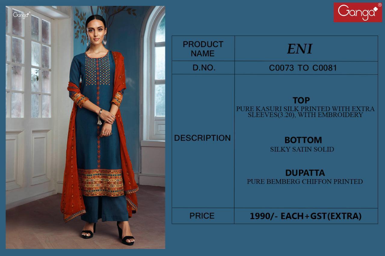 Buy Online Eni By Ganga Series C0073 Designer Party Wear Suits Wholesale Supplier Gujarat 9 Pcs of Full Catalogue at Wholesale Price. Looking for Eni By Ganga Series C0073 Designer Party Wear Suits Wholesale Supplier Gujarat Full Catalouge at Best Price? Buy Now Eni By Ganga Series C0073 Designer Party Wear Suits Wholesale Supplier Gujarat at Wholesale Rate of Rs 17910 with Total 9 Pcs from authroized dealer and supplier of GANGA Brand. Cost of Each piece is just only Rs 1990 which is very low and affordable price to resale the product in your retail store ,This is Surat based Wholesale Supplier & Dealer of GANGA Brand. Click on Brand name to Know more about GANGA Brand's products.Call or Whatsapp on 9898838984 for booking or enquiry